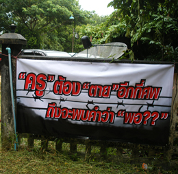 บรรยายภาพ : ป้ายข้อความแสดงอารมณ์ความรู้สึกของครูชายแดนใต้ เมื่อครั้งที่ครูสองสามีภรรยา คือ นายวิลาศ เพชรพรหม และ นางคมขำ เพชรพรหม จากโรงเรียนบ้านมะนังกาหยี อ.เมืองนราธิวาส ถูกยิงเสียชีวิต เมื่อวันที่ 7 ก.ย.2553 จนทำให้โรงเรียน 365 แห่งต้องประกาศปิดการเรียนการสอนเป็นการชั่วคราว (ภาพจากแฟ้มภาพอิศรา)