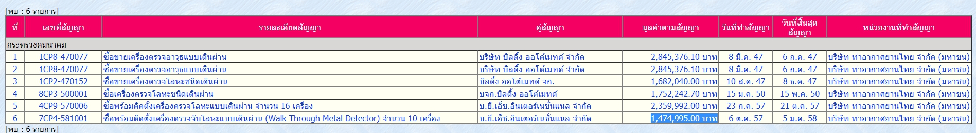 1.สัญญาจัดซื้อขายเครื่องตรวจอาวุธแบบเดินผ่าน มูลค่า 2,845,376.10 บาท โดยซื้อขายกับ บริษัท บิลดิ้ง ออโต้เมทด์ จำกัด วันที่ทำสัญญา 8 มี.ค. 2547 สิ้นสุดสัญญา 6 ก.ค. 2547