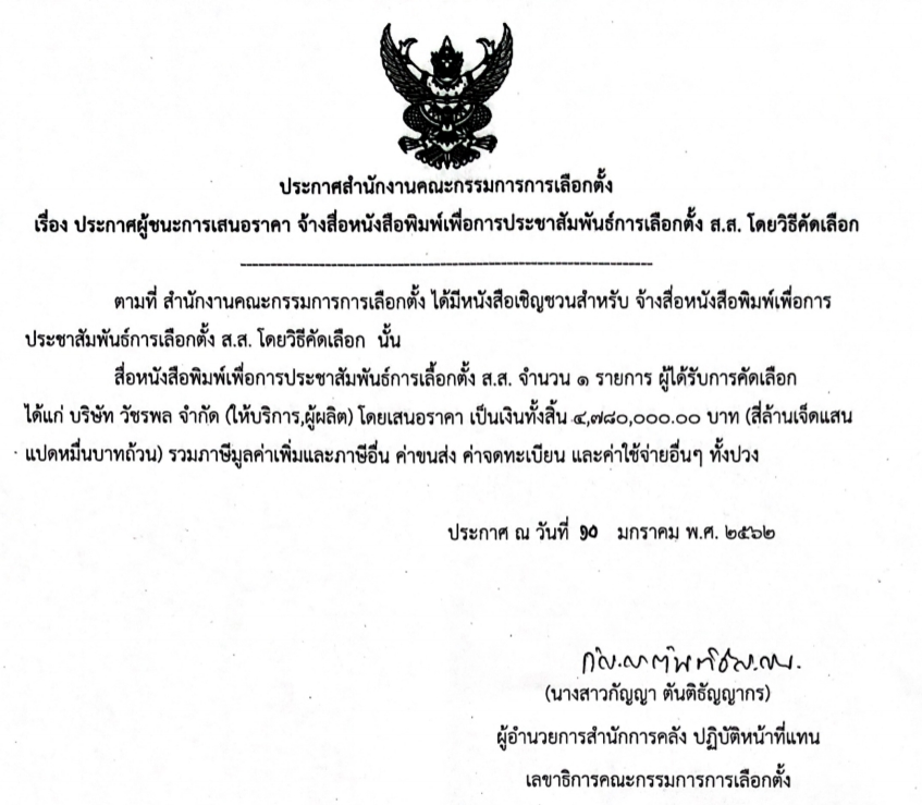2. จ้างสื่อหนังสือพิมพ์เพื่อการประชาสัมพันธ์การเลือกตั้ง ส.ส. โดยวิธีคัดเลือก ผู้ชนะการเสนอราคาได้แก่ บริษัท วัชรพล จํากัด (ให้บริการ ผู้ผลิต) โดยเสนอราคา เป็นเงินทั้งสิ้น 4,780,000 บาท