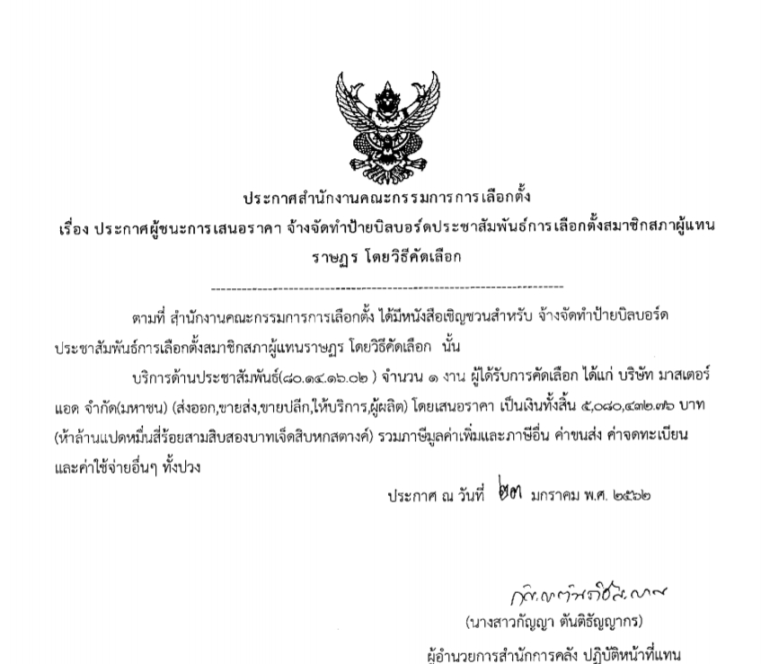 3.จ้างจัดทําป้ายบิลบอร์ดประชาสัมพันธ์การเลือกตั้งสมาชิกสภาผู้แทน ราษฎร โดยวิธีคัดเลือก ผู้ชนะการเสนอราคาได้แก่ ได้แก่ บริษัท มาสเตอร์ แอด จํากัด(มหาชน) (ส่งออก,ขายส่ง,ขายปลีก ให้บริการผู้ผลิต) โดยเสนอราคา เป็นเงินทั้งสิ้น 5,080,432.76 บาท