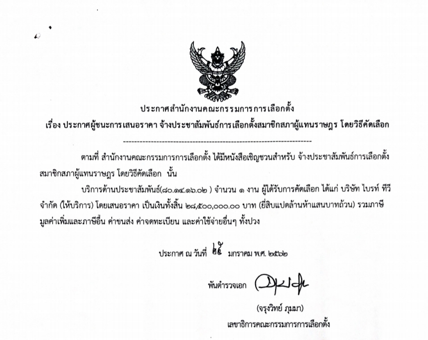 4.จ้างประชาสัมพันธ์การเลือกตั้งสมาชิกสภาผู้แทนราษฎร โดยวิธีคัดเลือก ผู้ชนะการเสนอราคาได้แก่ ได้แก่ บริษัท ไบรท์ ทีวี จํากัด (ให้บริการ) โดยเสนอราคา เป็นเงินทั้งสิ้น 28,500,000 บาท