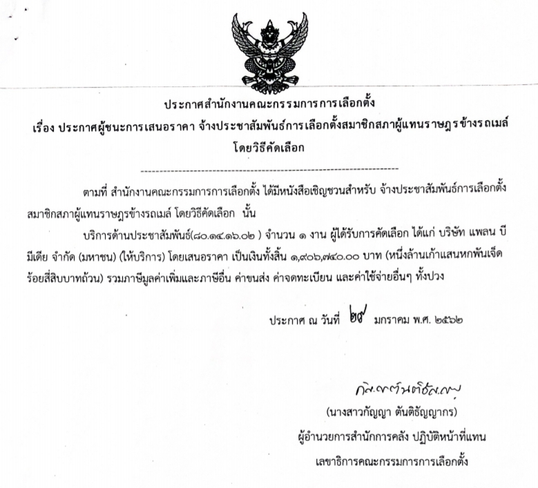 5.จ้างประชาสัมพันธ์การเลือกตั้งสมาชิกสภาผู้แทนราษฎรข้างรถเมล์ โดยวิธีคัดเลือก ผู้ชนะการเสนอราคาได้แก่ บริษัท แพลน บี มีเดีย จํากัด (มหาชน) (ให้บริการ) โดยเสนอราคา เป็นเงินทั้งสิ้น 1,906,740 บาท