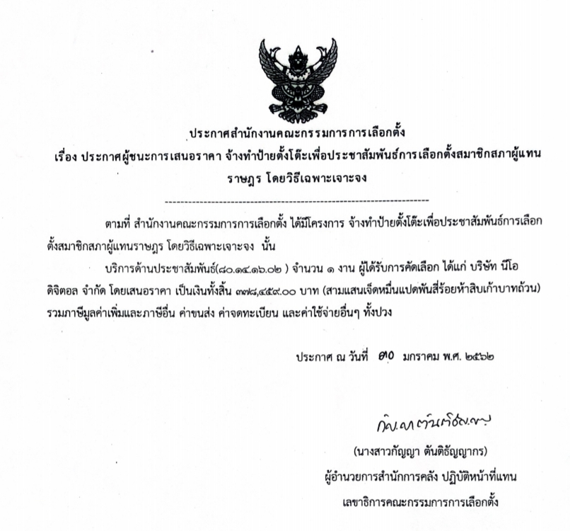 และ 6.จ้างทําป้ายตั้งโต๊ะเพื่อประชาสัมพันธ์การเลือกตั้งสมาชิกสภาผู้แทน ราษฎร โดยวิธีเฉพาะเจาะจง ผู้ชนะการเสนอราคาได้แก่ บริษัท นีโอ ดิจิตอล จํากัด โดยเสนอราคา เป็นเงินทั้งสิ้น 378,459 บาท