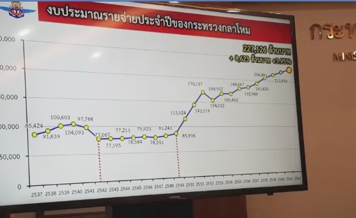 โฆษกกระทรวงกลาโหม ระบุ งบประมาณกลาโหมเคยลงไปต่ำสุดปี 2549 อยู่ที่ 6.32% ของงบประมาณทั้งประเทศ จากนั้นค่อยๆ ขยับอยู่ที่ 7-8% จนถึงปัจจุบัน โอดช่วงวิกฤติเศรษฐกิจ กองทัพไม่มีงบฯ แม้กระทั่งการฝึก น้ำมัน การปฏิบัติบำรุงยุทโธปกรณ์ไม่มี นักบินอยู่ไม่ได้เกิดสมองไหล ไล่ไปดูอยู่ช่วงรัฐบาลไหน
