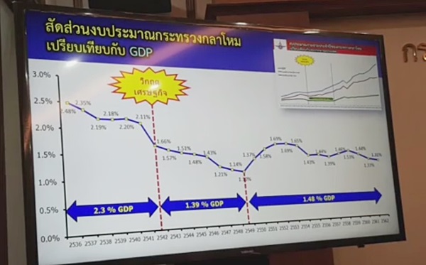 ทั้งนี้ โฆษกกระทรวงกลาโหม เปรียบเทียบงบประมาณของกระทรวงกลาโหมกับตัวเลขผลิตภัณฑ์มวลรวมในประเทศ (GDP) พบว่า ปี2536-2541 อยู่ที่ 2.3% ของ GDP พอเกิดวิกฤตเศรษฐกิจ เหลือ 1.4-1.5% ของ GDP จนถึง 1.1 % ของ GDP ขณะที่แผนพัฒนาขีดความสามารถกองทัพเราตั้งไว้ที่ 2% ของ GDP ซึ่งกองทัพเคยได้เมื่อปี 2536-2542