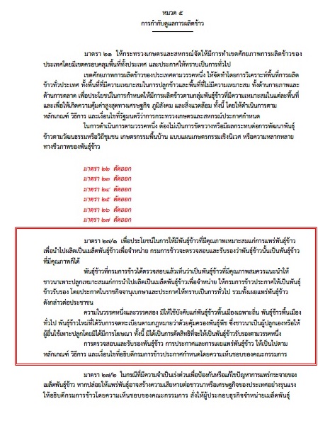 ส่วนมาตราที่เกี่ยวกับการควบคุมกำกับพันธุ์ข้าว และการจำหน่ายเมล็ดพันธุ์ ในมาตรา 22-28 ก็ถูกตัดออก