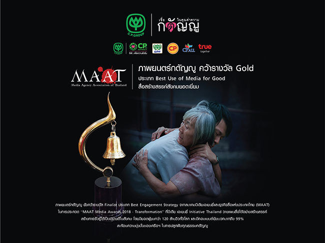 ภาพยนตร์ “กตัญญู” จากเครือเจริญโภคภัณฑ์ คว้ารางวัล Gold ประเภท Best Use of Media for Good และ รางวัล Finalist ประเภท Best Engagement Strategy จากสมาคมมีเดียเอเยนซี่ และธุรกิจสื่อแห่งประเทศไทย (MAAT)
