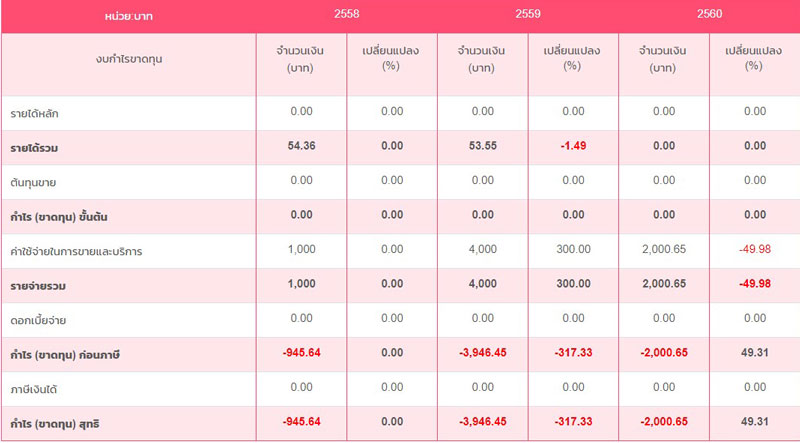 ส่วนปี 2559 แจ้งว่ามีรายได้รวม 53.55 บาท แต่มีรายจ่ายรวม 4,000 บาท เป็นค่าใช้จ่ายในการบริหารทั้งหมด ขาดทุนสุทธิ 3,946.45 บาท