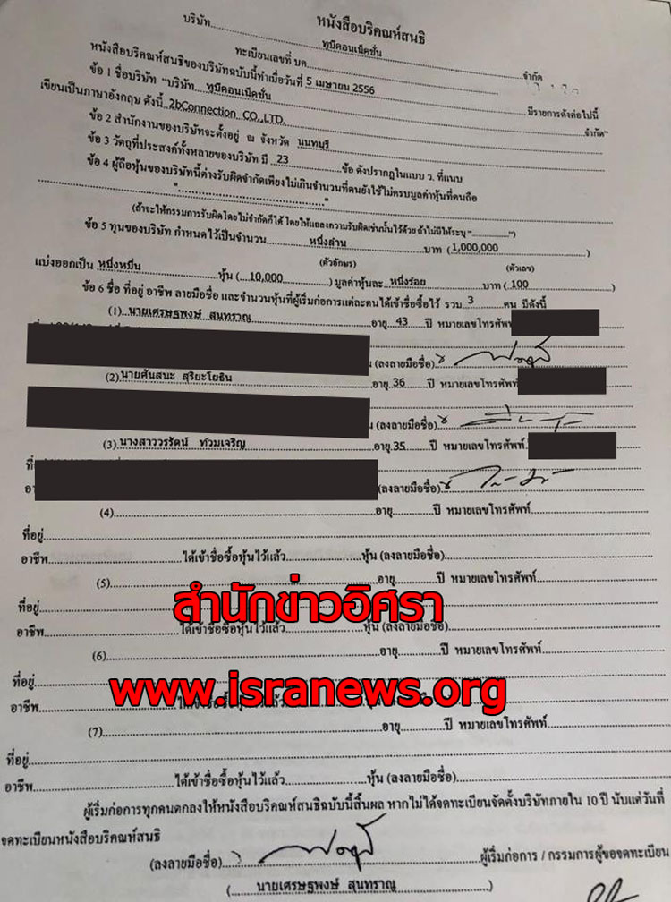 เมื่อวันที่ 6 มี.ค. 2561 สำนักข่าวอิศราตรวจสอบข้อมูลเชิงลึกจากกรมพัฒนาธุรกิจการค้า พบว่า บริษัทแห่งนี้แจ้งจดทะเบียนเมื่อวันที่ 11 เม.ย. 2556 ใช้ชื่อแรกว่า บริษัท ทูบีคอนเน็คชั่น จำกัด มีนายเศรษฐพงษ์ สุนทราญ นายศันสนะ สุริยะโยธิน (ผู้สมัคร ส.ส. กทม. เขต 22 พรรคพลังประชารัฐ) และ น.ส.วรรัตน์ ท้วมเจริญ เป็นผู้ก่อตั้ง มีนายเศรษฐพงษ์ เป็นกรรมการคนแรก ทุนก่อตั้ง 1 ล้านบาท แบ่งเป็น 10,000 หุ้น โดยนายเศรษฐพงษ์ ถือ 5,000 หุ้น นายศันสนะ และ น.ส.วรรัตน์ ถือคนละ 2,500 หุ้น (ดูเอกสารประกอบ)