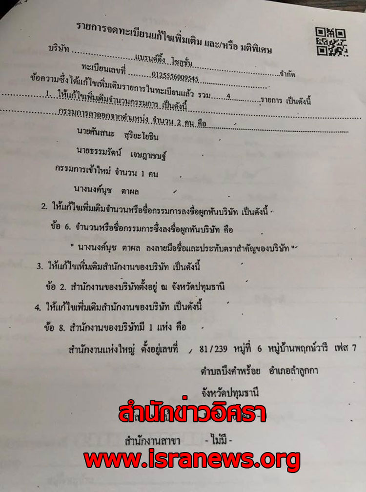 หลังจากนั้นเมื่อวันที่ 28 ม.ค. 2562 แจ้งเปลี่ยนกรรมการใหม่อีกครั้ง โดยนายศันสนะ สุริยะโยธิน นายธรรมรัตน์ เจษฎาเชษฐ์ และนายทศพล ตาผล พ้นจากกรรมการ มีนางนงค์นุช ตาผล เป็นกรรมการใหม่ และแจ้งเพิ่มที่ตั้งบริษัทอีกแห่งเป็นที่อยู่ 81/239 ม.6 หมู่บ้านพฤกษ์วารี เฟส 7 ตำบลบึงคำพร้อย อำเภอลำลูกกา จังหวัดปทุมธานี (ดูเอกสารประกอบ)