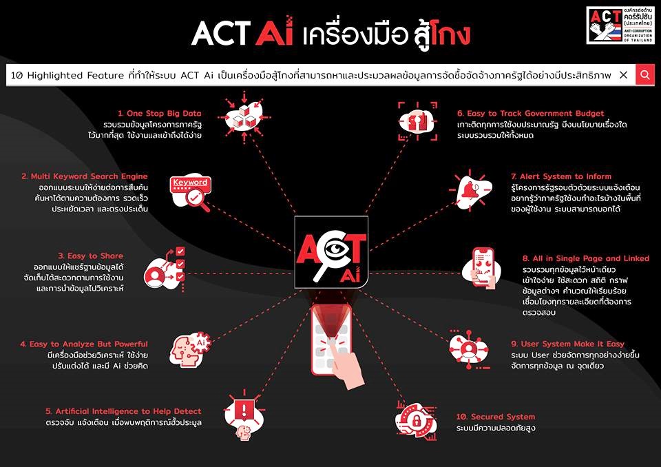 ประธานองค์กรต่อต้านคอร์รัปชันประเทศไทย กล่าวต่อว่า จากปัญหาดังกล่าวจึงได้จัดทำระบบของการตรวจสอบข้อมูลจัดซื้อจัดจ้างภาครัฐ ที่เรียกว่า ACT Ai ขึ้นมา ได้รับความร่วมมือเพื่อเป็นการนำร่องจากหน่วยงานสำคัญของภาครัฐ 3 แห่ง แห่งแรกเป็นระบบการจัดซื้อจัดจ้างของภาครัฐจากกลมบัญชีกลาง ส่วนต่อมาเป็นข้อมูลเกี่ยวกับธุรกิจจากกรมพัฒนาธุรกิจการค้า และสุดท้ายเป็นข้อมูลจากป.ป.ช. (คณะกรรมการป้องกันและปราบปรามการทุจริตแห่งชาติ) และเชื่อว่าในอนาคตจะได้รับความร่วมมือ เรื่องการให้ข้อมูลความโปร่งใสจากหน่วยงานอื่นๆ กว้างมากขึ้น