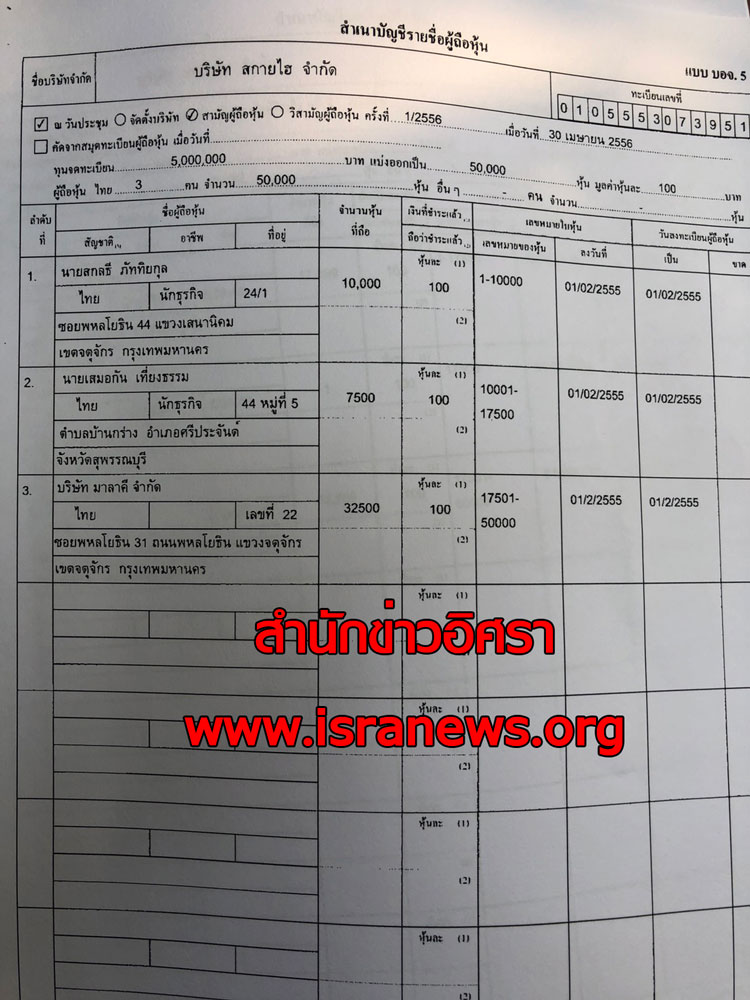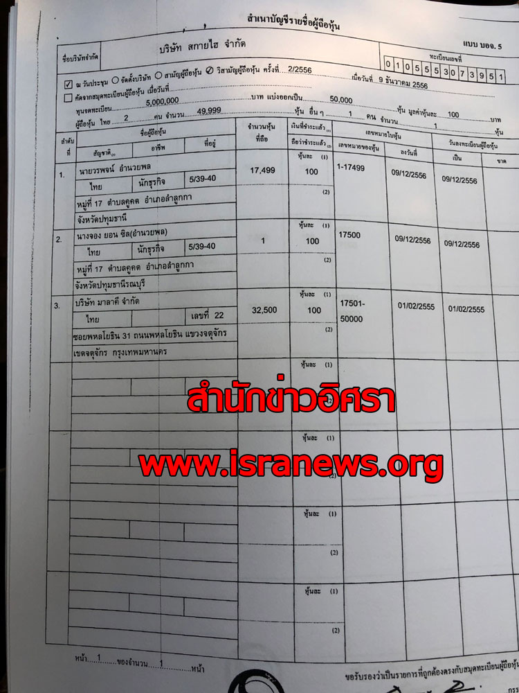 โดยนายเสมอกัน นายสกลธี ถือหุ้นจนถึงกระทั่งเปลี่ยนชื่อบริษัทเป็น บริษัท สกายไฮ จำกัด ต่อมาเมื่อวันที่ 26 ธ.ค. 2556 จึงมีการเปลี่ยนโครงสร้างผู้ถือหุ้นอีกครั้ง และบริษัทจดทะเบียนเพิ่มทุนเป็น 5 ล้านบาท โดยมีบริษัท มาลาคี จำกัด เป็นผู้ถือหุ้นใหญ่ 32,500 หุ้น นายวรพจน์ อำนวยพล 17,499 หุ้น และนางจอง ยอน ซิล (อำนวยพล) ถือ 1 หุ้น