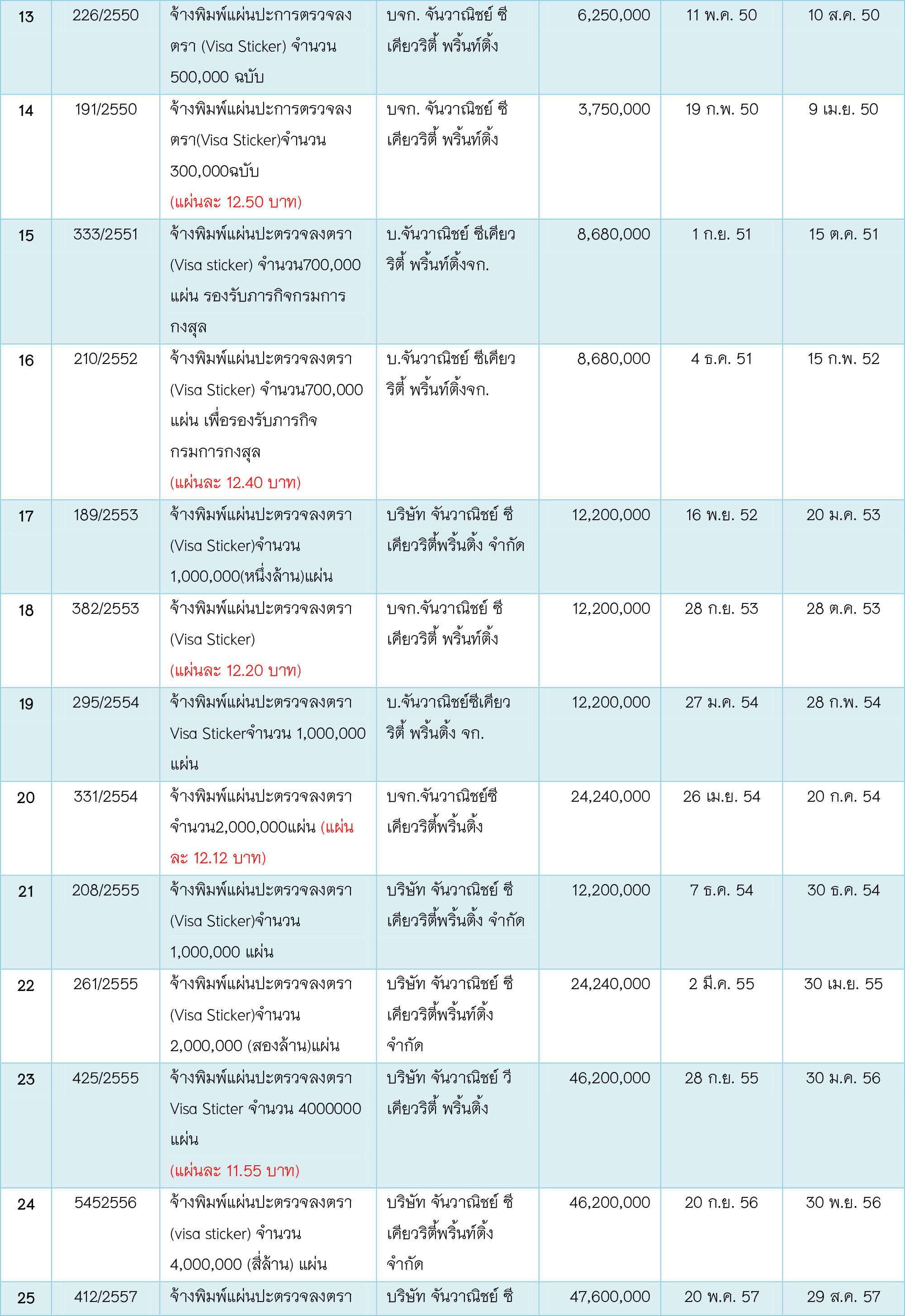 3.ในจำนวน 30 สัญญา ราคาสูงสุดที่เอกชน (บริษัท จันวาณิชย์ ซีเคียวริตี้ พริ้นท์ติ้ง จำกัด) เป็นผู้ชนะ คือ จัดจ้างพิมพ์แผ่นปะสำหรับการตรวจลงตรา (Visa Sticker) จำนวน 500,000 ฉบับ วงเงิน 6,925,000 บาท หรือ ฉบับ (แผ่น) ละ 13.85 บาท เมื่อ วันที่ 28 มี.ค. 46 (สัญญาที่ 154/2546) ราคาต่ำสุดคือ จ้างพิมพ์ 3,500,000 แผ่น วงเงิน 17,500,000 บาท หรือ แผ่นละ 5 บาท โดยธนาคารแห่งประเทศไทยเมื่อวันที่ 5 พ.ค.2560 (สัญญาเลขที่ 561/2560 เป็นที่มาของราคากลางในการประกวดราคาครั้งล่าสุด)
