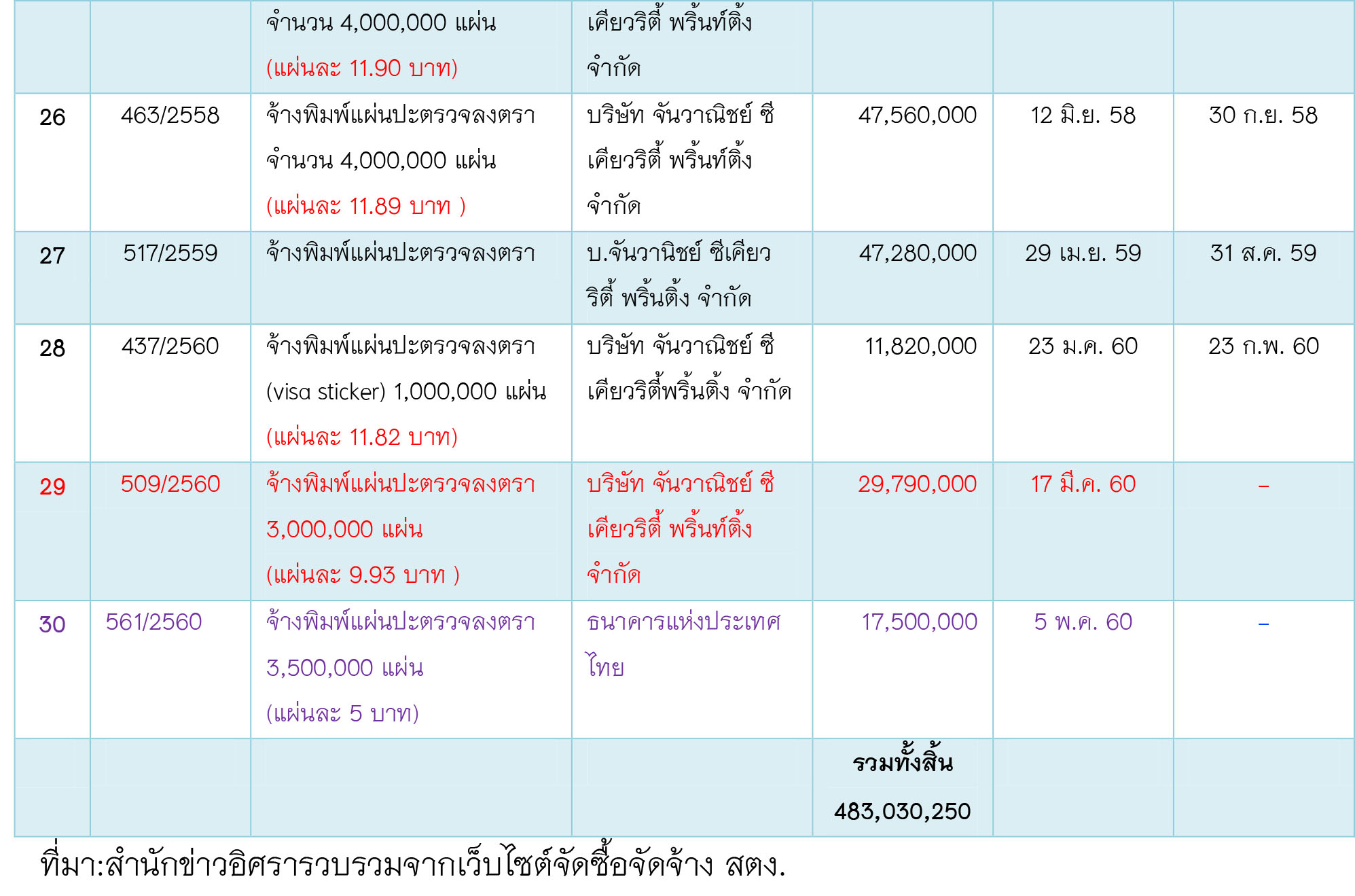 17 มี.ค. 2560 ว่าจ้างพิมพ์ 3,000,000 แผ่น ในราคา 29,790,000 บาท (แผ่นละ 9.93 บาท )