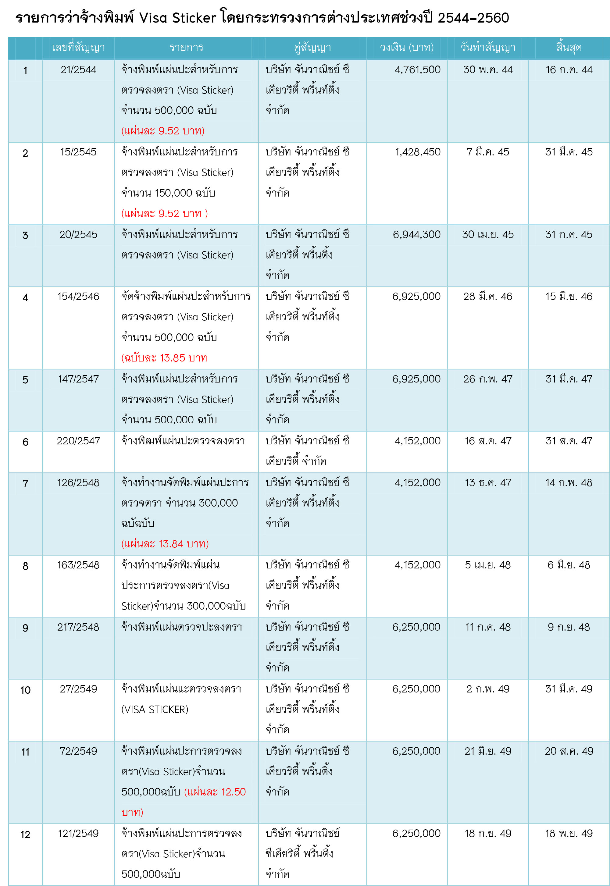 หลายคนอาจไม่ทราบว่า การจ้างพิมพ์ Visa Sticker ในอดีตจนถึงปัจจุบัน กระทรวงการต่างประเทศว่าจ้างเอกชนในราคาเท่าใดและใครเป็นคู่สัญญาบ้าง?