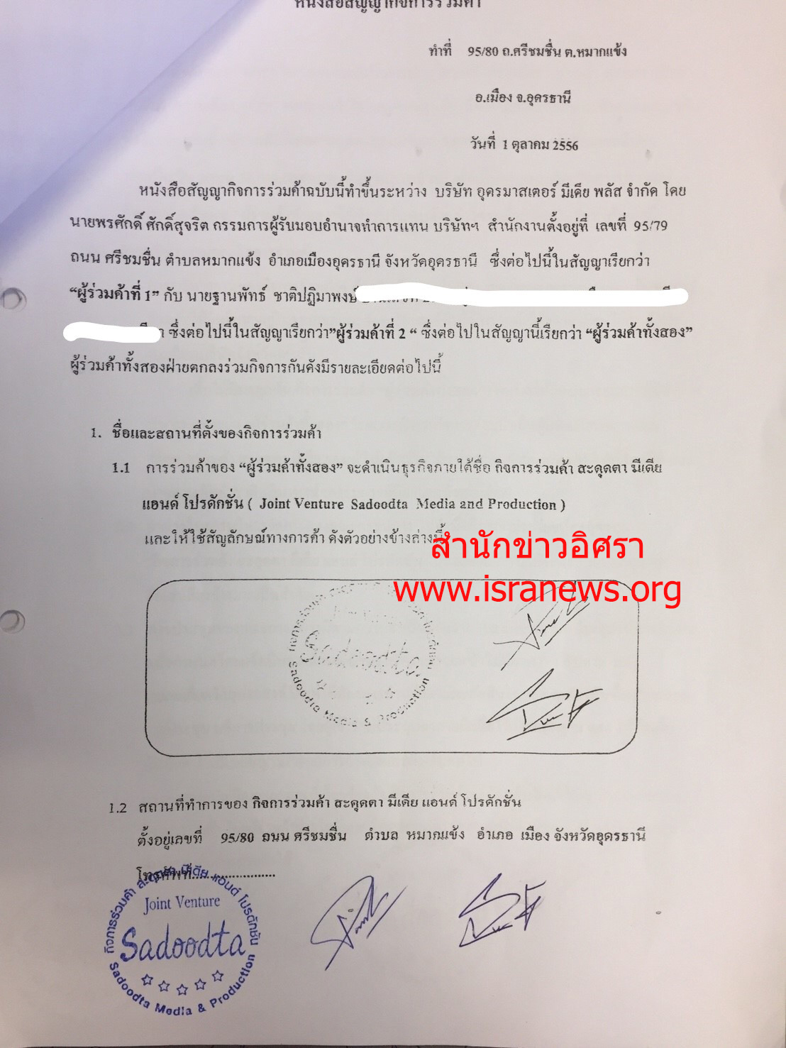 ในหนังสือสัญญากิจการร่วมค้า ปรากฎชื่อ บริษัท อุดรมาสเตอร์ มีเดีย พลัส เป็นผู้ร่วมค้าที่ 1 และ นายฐานพัทธ์ ชาติปฏิมาพงษ์ เป็นผู้ร่วมค้าที่ 2