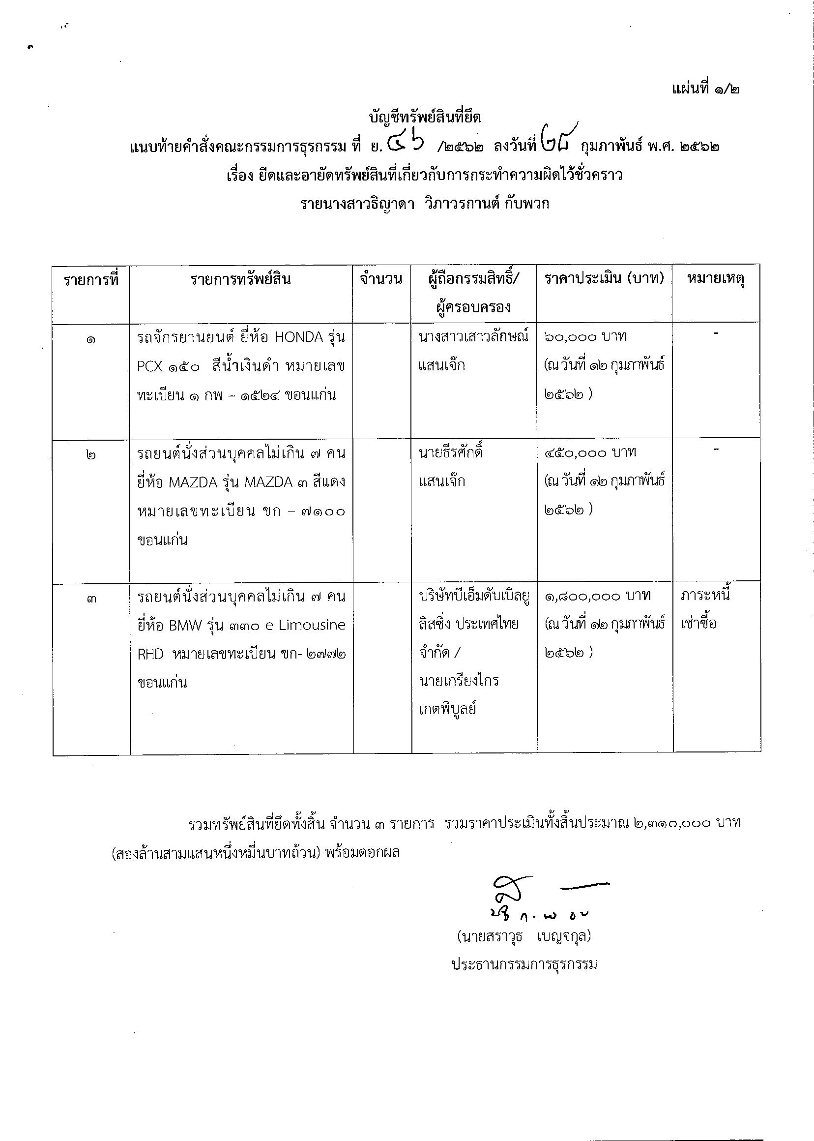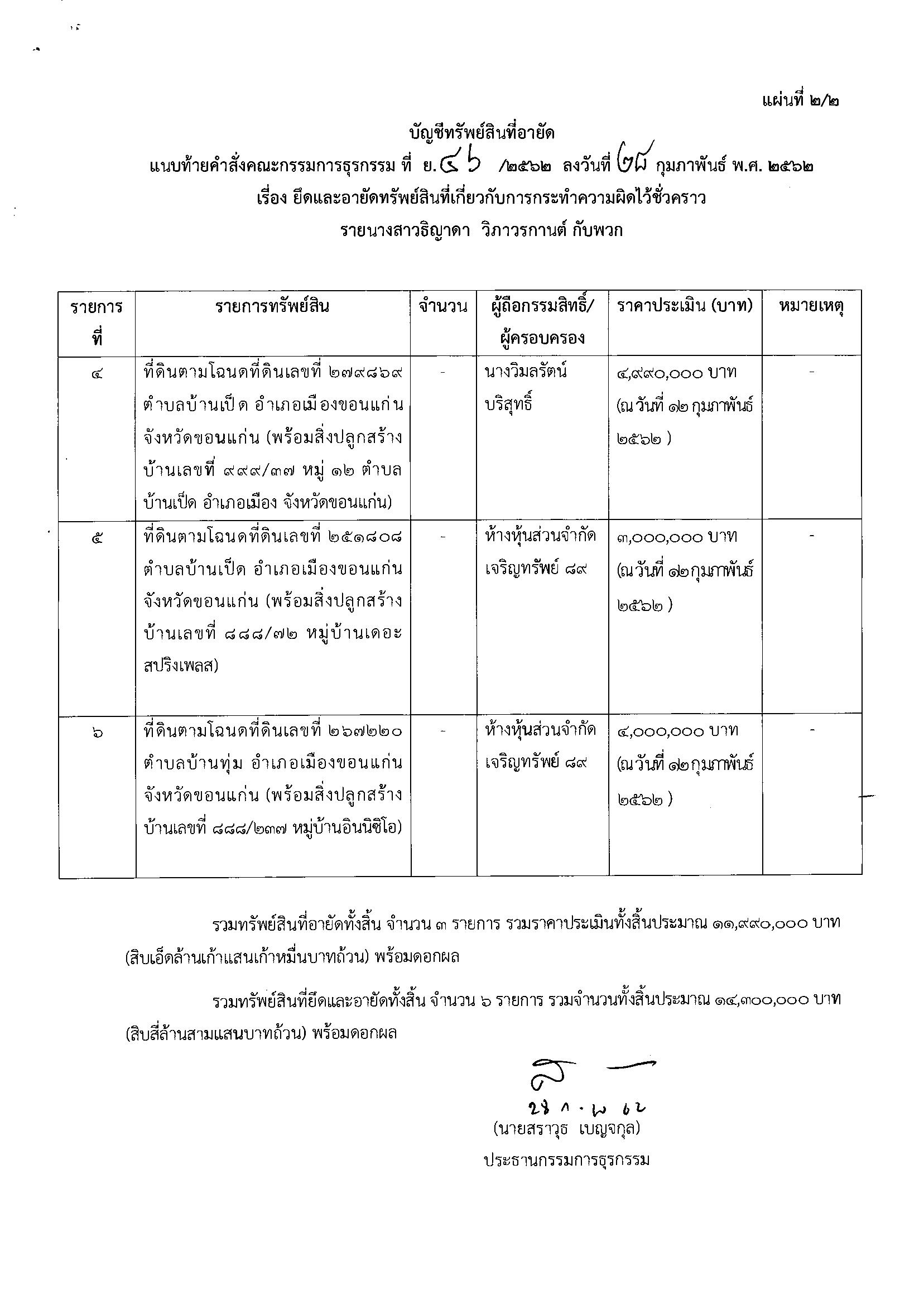 สำนักข่าวอิศรา www.isranews.org รายงานว่า เมื่อวันที่ 28 ก.พ.2562 คณะกรรมการธุรกรรมในสำนักงานคณะกรรมการป้องกันและปราบปรามการฟอกเงิน (ปปง.) มีคำสั่งอายัดที่ ย. 46 /2562 เรื่อง ยึดและอายัดทรัพย์สินที่เกี่ยวกับการกระทำความผิดไว้ชั่วคราวราย น.ส.ธิญาดา วิภาวรกานต์ กับพวก ในฐานความผิด การฉ้อโกงประชาชน ทรัพย์สินที่ถูกยึดและอายัด จำนวน 5 รายการ ราคาประเมิน 14,300,000 บาท ได้แก่