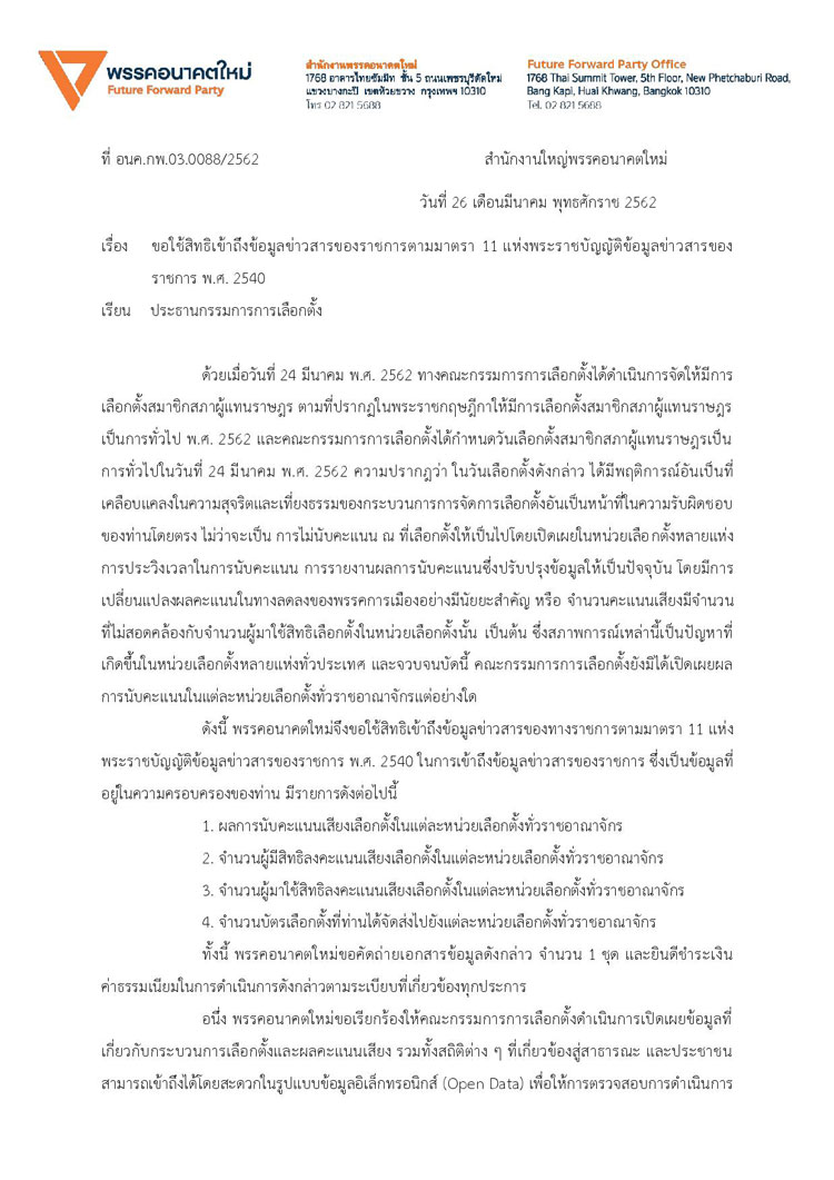 พรรคอนาคตใหม่ ใช้สิทธิ พ.ร.บ.ข้อมูลข่าวสารฯ ยื่น กกต. เปิดเผยข้อมูล-ตัวเลขการใช้สิทธิ์ลงคะแนนเสียงเลือกตั้ง ส.ส. เปิดโอกาสให้สังคมร่วมตรวจสอบความถูกต้อง