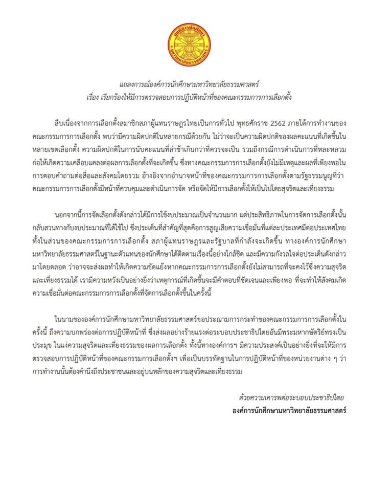 ในนามขององค์การนักศึกษามหาวิทยาลัยธรรมศาสตร์ขอประณามการกระทำของคณะกรรมการการเลือกตั้งในครั้งนี้ ถึงความบกพร่องต่อการปฏิบัติหน้าที่ ซึ่งส่งผลอย่างร้ายแรงต่อระบอบประชาธิปไตยอันมีพระมหากษัตริย์ทรงเป็นประมุข ในแง่ความสุจริตและเที่ยงธรรมของผลการเลือกตั้ง