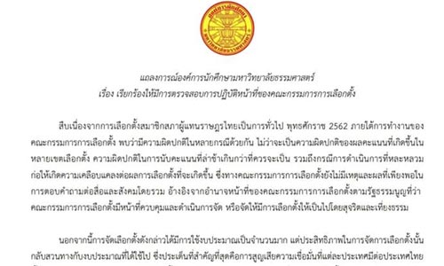 องค์การนักศึกษา มธ.ประณาม กกต. ปฏิบัติบกพร่อง เเง่สุจริตผลเลือกตั้ง