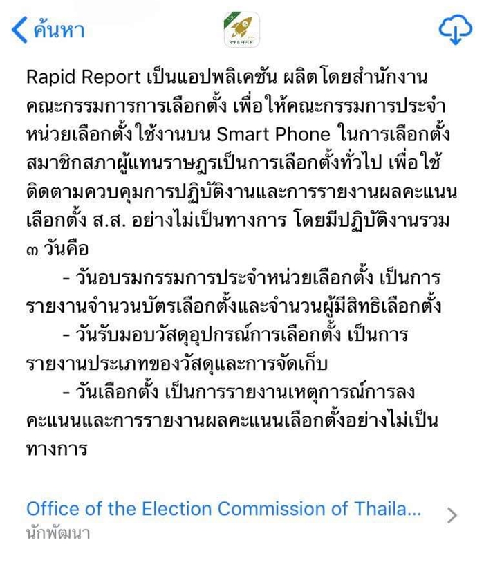 จากการตรวจสอบข้อมูลเกี่ยวกับ Rapid Report เพิ่มเติมระบบ ECT Rapid ใน App Store พบว่า ในรายละเอียดของแอปพลิเคชั่น ระบุว่า "Rapid Report เป็นแอปพลิเคชั่น ผลิตโดยสำนักงานคณะกรรมการการเลือกตั้ง เพื่อให้คณะกรรมการประจำหน่วยเลือกตั้งใช้งานบน Smart Phone ในการเลือกตั้งสมาชิกสภาผู้แทนราษฎรเป็นการเลือกตั้งทั่วไป เพื่อใช้ติดตามควบคุมการปฏิบัติงานและรายงานผลคะแนนเลือกตั้ง ส.ส. อย่างไม่เป็นทางการ