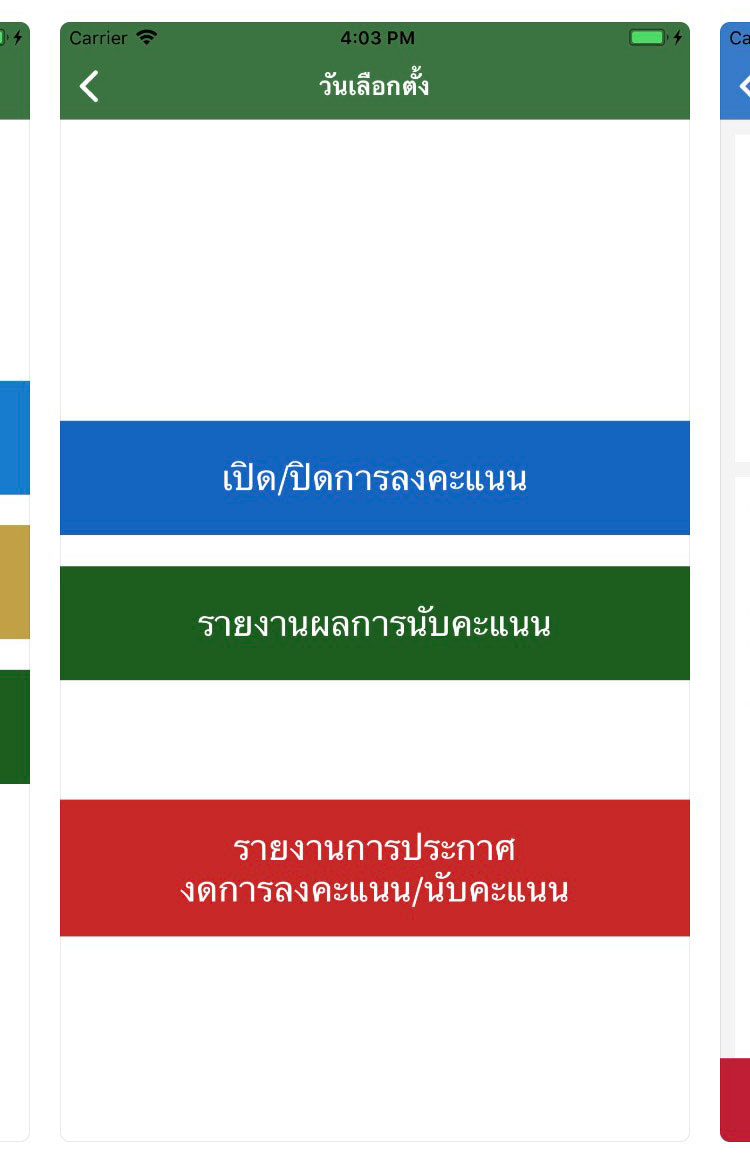 ภายในแอปพลิเคชั่น แบ่งย่อยเป็น การบันทึกข้อมูล ทั้งวันอบรมการใช้งาน วันรับมอบวัสดุอุปกรณ์ และวันเลือกตั้ง ในส่วนของวันเลือกตั้งนั้น เปิดเผยข้อมูลในส่วนการเปิด/ปิดการลงคะแนน รายงานผลการลงคะแนน และรายงานการประกาศงดการลงคะแนน/นับคะแนน