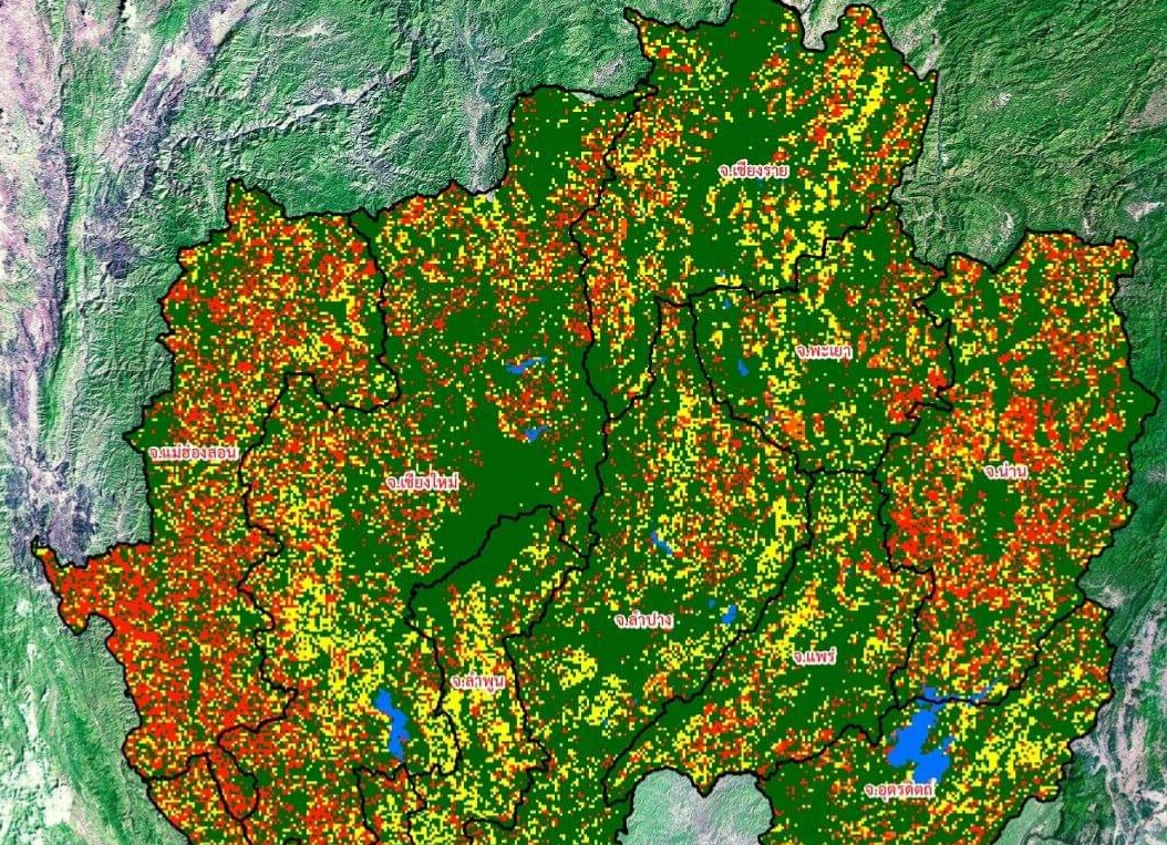 วันที่ 3 เมษายน กระทรวงวิทยาศาสตร์และเทคโนโลยี โดย จิสด้า เผยภาพข้อมูลจากดาวเทียมระบบ MODIS แสดงพื้นที่เสี่ยงการเกิดไฟป่าล่วงหน้า 7 วัน ในช่วงระหว่างวันที่ 1 – 7 เมษายน 2562 บริเวณ 10 จังหวัดภาคเหนือตอนบน พบหลายพื้นที่ในจังหวัดแม่ฮ่องสอน จังหวัดเชียงใหม่ จังหวัดตาก และจังหวัดน่าน มีความเสี่ยงสูง (สีแดง) ที่อาจจะเกิดไฟป่าได้มากกว่าจังหวัดอื่นๆ