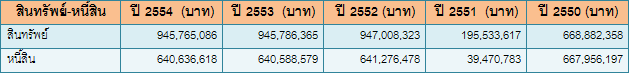 ปี 2554 สินทรัพย์ มูลค่า 945,765,086 บาท ในจำนวนนี้เป็นที่ดิน อาคาร และอุปกรณ์สุทธิ มูลค่า 944,973,840.47 บาท
