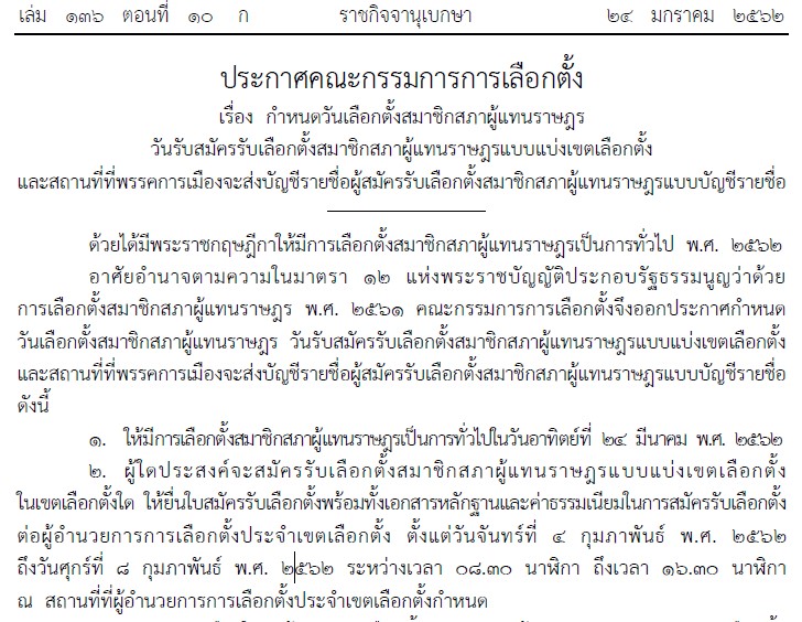 จากการตรวจสอบพบว่า คณะกรรมการการเลือกตั้ง (กกต.) ได้ออก ประกาศคณะกรรมการการเลือกตั้ง เมื่อวันที่ 24 ม.ค.2562 เรื่อง กำหนดวันเลือกตั้งสมาชิกสภาผู้แทนราษฎร วันรับสมัครรับเลือกตั้งสมาชิกสภาผู้แทนราษฎรแบบแบ่งเขตเลือกตั้ง และสถานที่ที่พรรคการเมืองจะส่งบัญชีรายชื่อผู้สมัครรับเลือกตั้งสมาชิกสภาผู้แทนราษฎรแบบบัญชีรายชื่อ