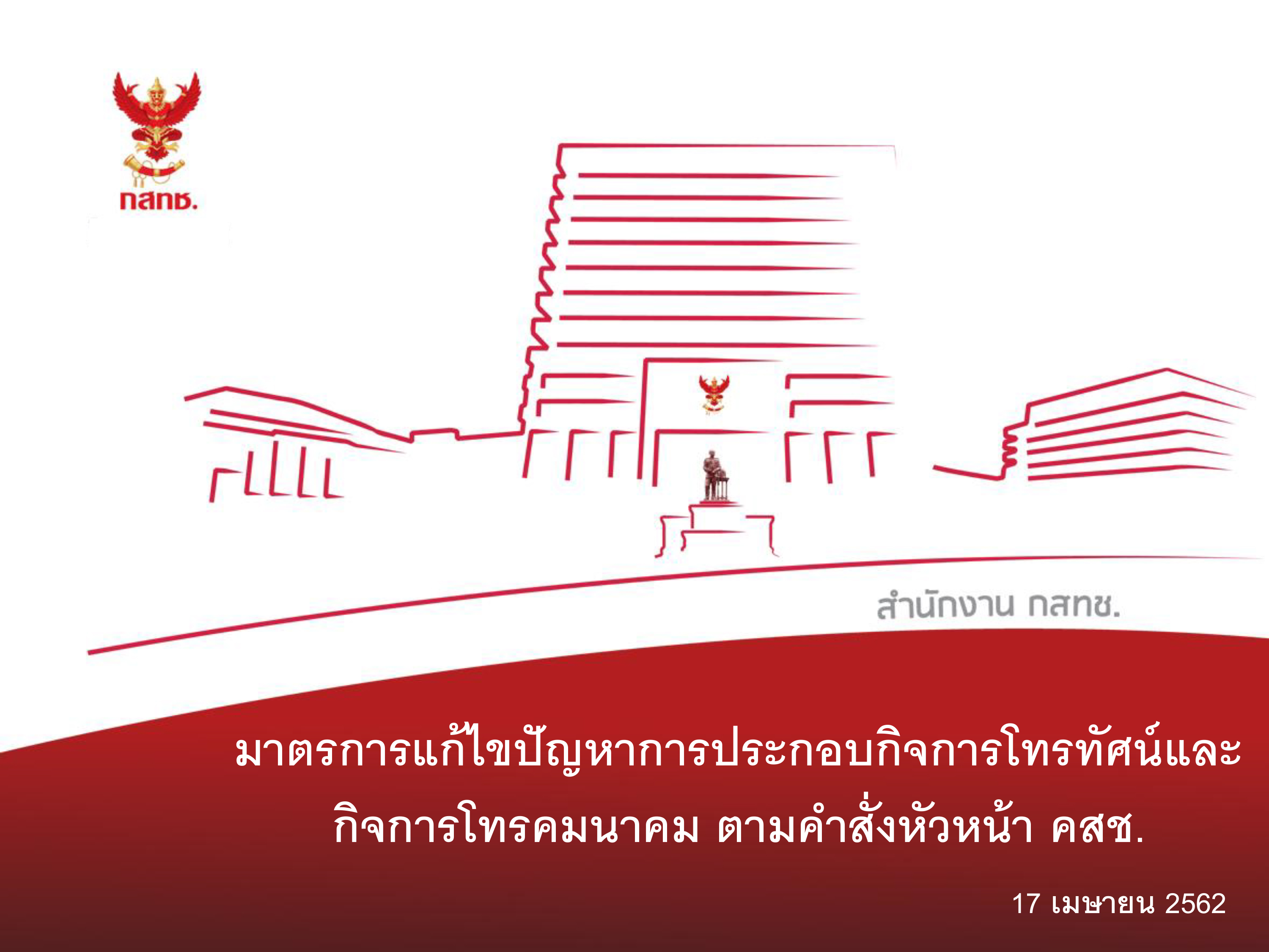 "....เป็นรายละเอียดมาตรการแก้ไขปัญหาการประกอบกิจการโทรทัศน์และกิจการโทรคมนาคม ของ สำนักงาน กสทช. ที่จัดเตรียมไว้ภายหลังจากที่ พล.อ.ประยุทธ์ จันทร์โอชา นายกรัฐมนตรี และหัวหน้าคณะรักษาความสงบแห่งชาติ (คสช.) มีคำสั่งหัวหน้าคณะรักษาความสงบแห่งชาติ (คสช.) ฉบับที่ 4/2562 เรื่อง มาตรการแก้ไขปัญหาการประกอบกิจการโทรทัศน์และกิจการโทรคมนาคม ซึ่งมีสาระสำคัญอยู่ที่การยืดจ่ายค่าคลื่น 900 จาก 4 งวดเป็น 10 งวด และช่วยทีวีดิจิทัลให้คืนใบอนฺญาตได้ ไม่จ่ายค่าประมูล 2 งวดที่เหลือ และกสทช. จ่ายค่า Mux ให้..."
