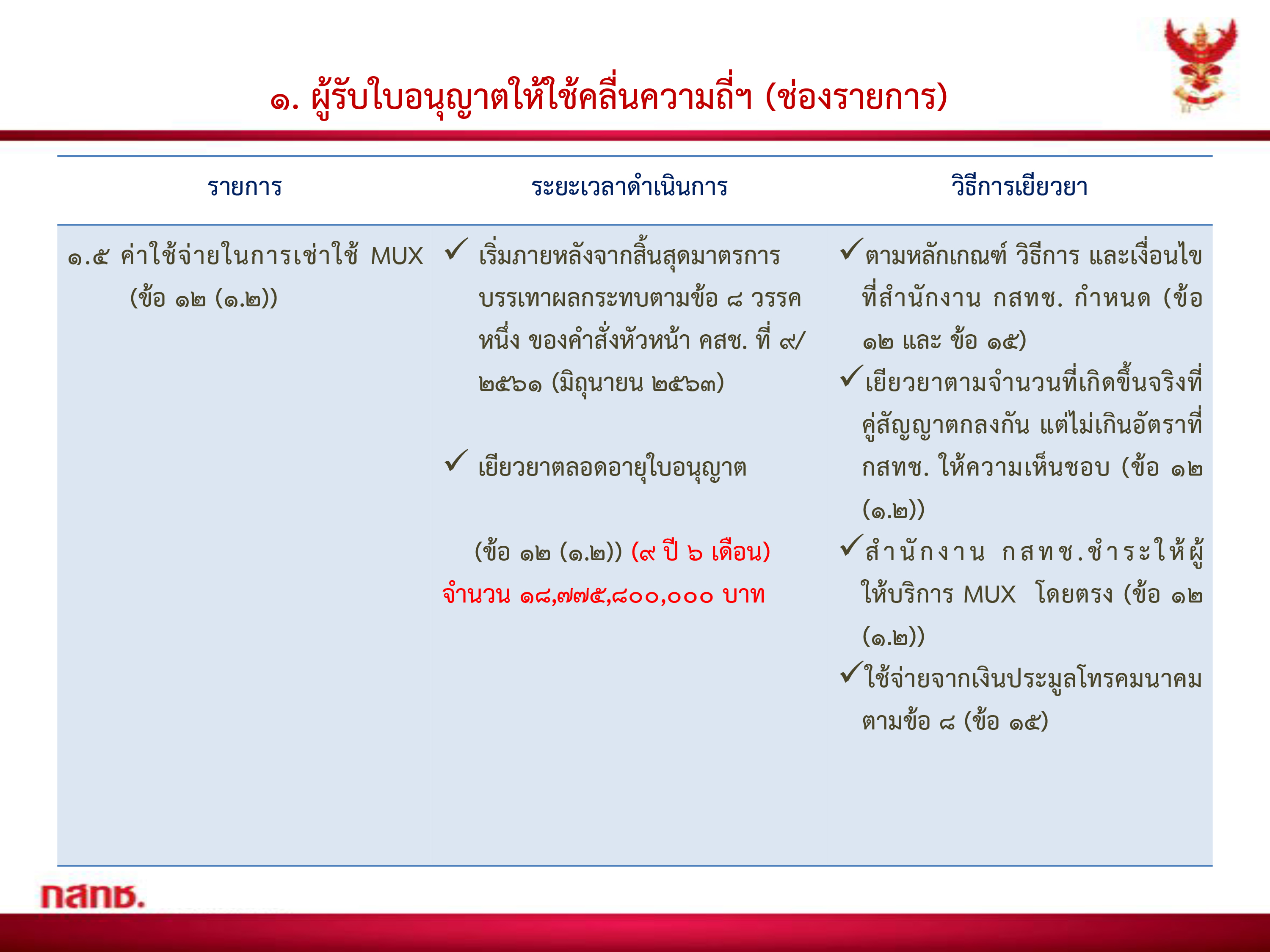 ค่าใช้จ่ายในการเช่าใช้โครงข่ายโทรทัศน์ประเภทที่ใช้คลื่นความถี่ภาคพื้นดินในระบบดิจิทัล (MUX) ตลอดระยะเวลาการได้รับอนุญาตการให้บริการโทรทัศน์ดิจิทัลที่เหลืออยู่ โดยให้เริ่มมีผลภายหลังจากสิ้นสุดมาตรการบรรเทาผลกระทบตามข้อ 8 วรรคหนึ่ง ของคำสั่งหัวหน้าคณะรักษาความสงบแห่งชาติ ที่ 9/2561 เรื่อง มาตรการบรรเทาผลกระทบต่อผู้ประกอบกิจการวิทยุกระจายเสียงวิทยุโทรทัศน์ และกิจการกระจายเสียงและกิจการโทรทัศน์ ทั้งนี้ การสนับสนุนดังกล่าวให้สำนักงานกสทช. จ่ายให้แก่ผู้รับใบอนุญาตให้บริการโครงข่ายเพื่อให้บริการโทรทัศน์ในระบบดิจิตอล ตามจำนวนที่เกิดขึ้นจริงที่คู่สัญญาตกลงกัน ซึ่งจะต้องไม่เกินอัตราที่ กสทช. ให้ความเห็นชอบ (อ่านประกอบ : คำสั่ง ม.44 ยืดจ่ายค่าคลื่น 900 จาก 4 เป็น 10 งวด -ช่วยทีวีดิจิตอลคืนใบอนฺญาตได้)