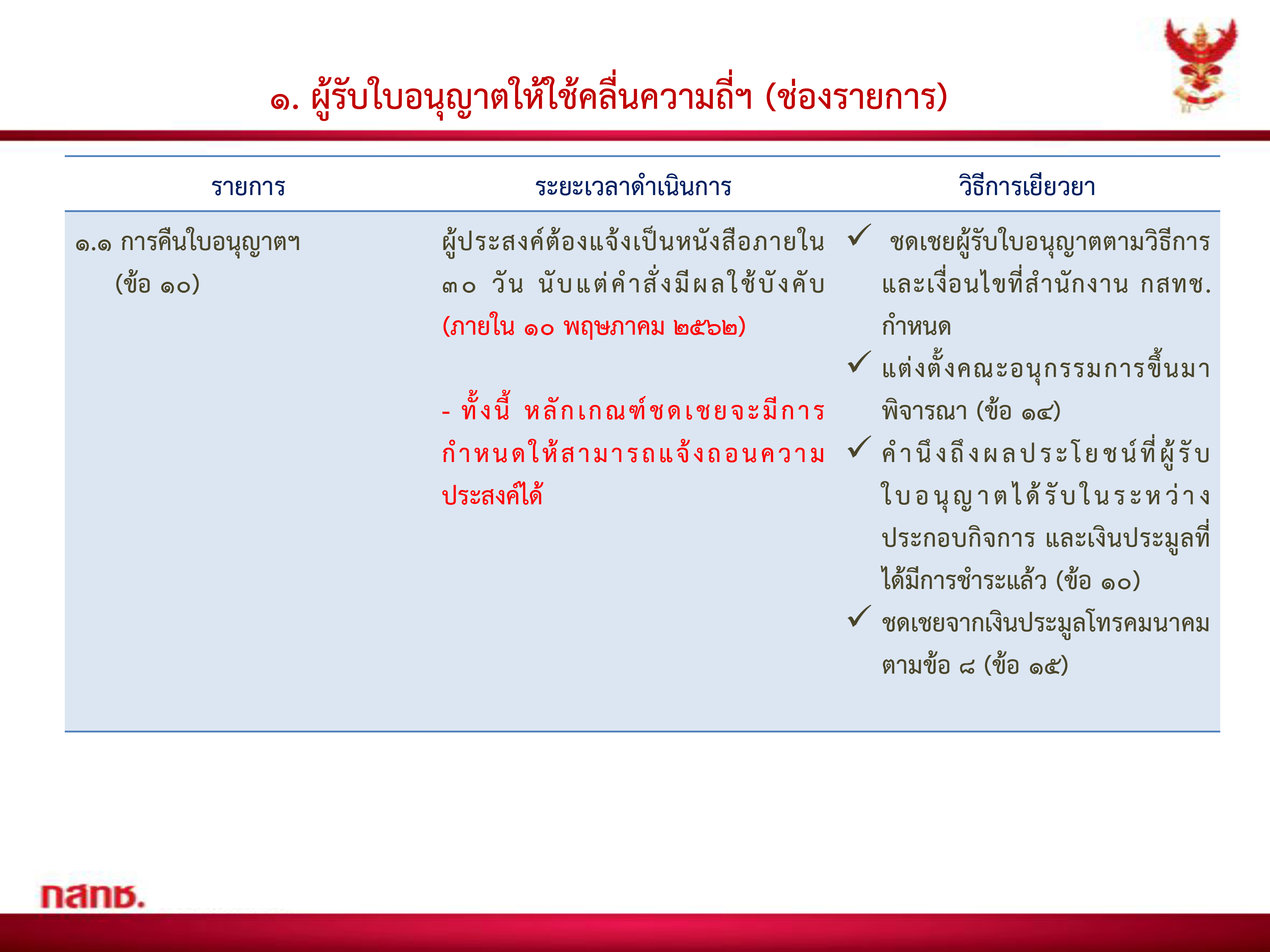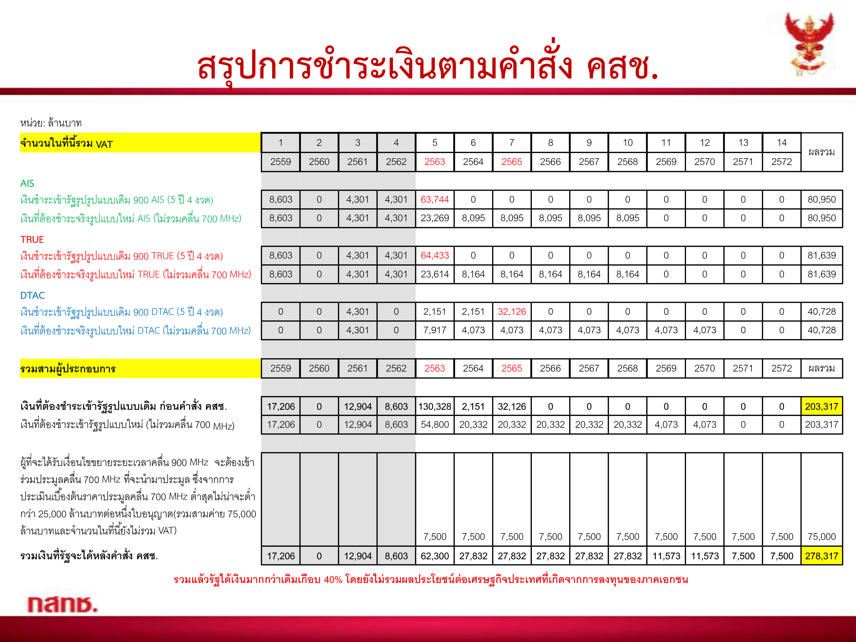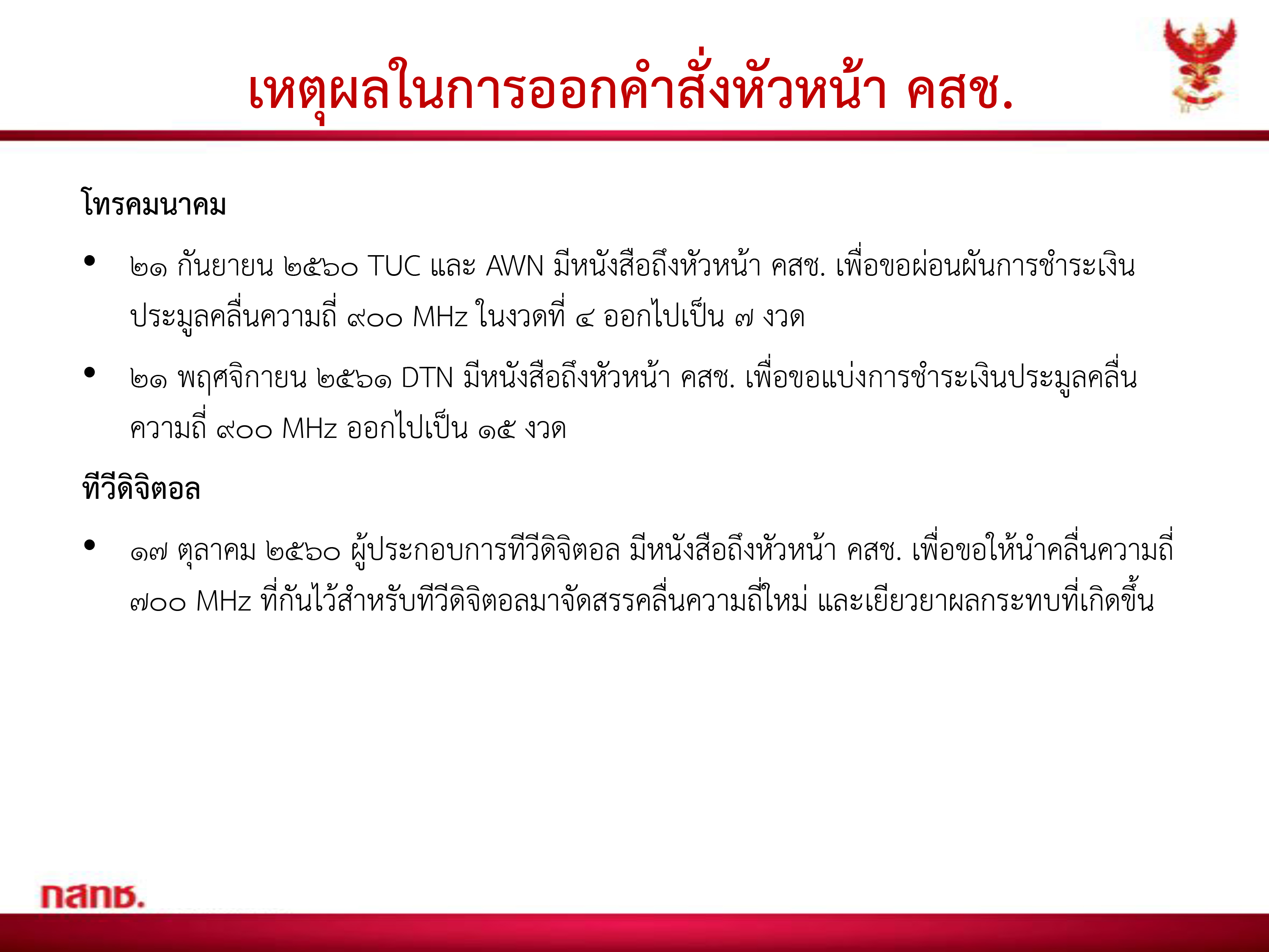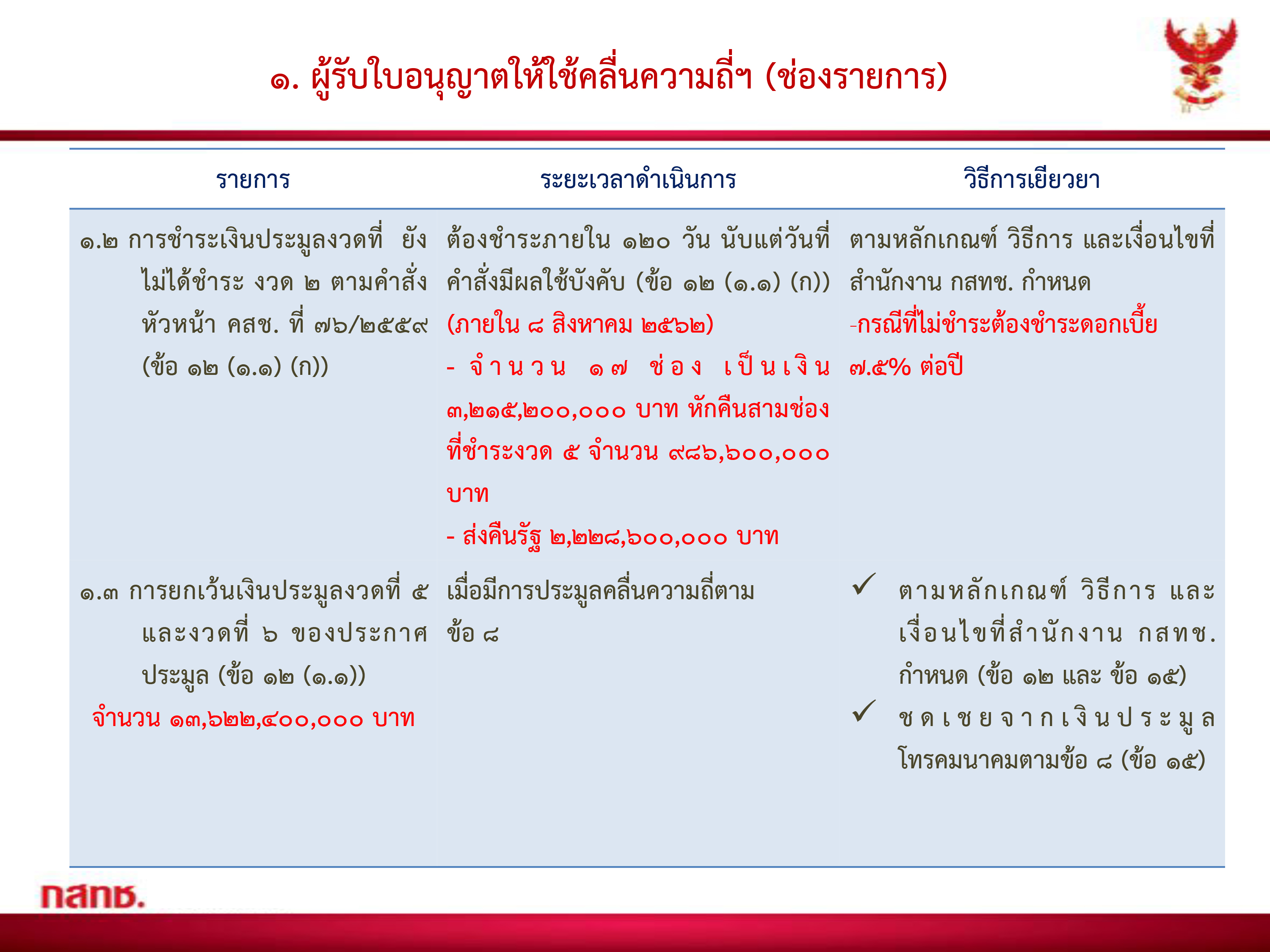 โดยผู้รับใบอนุญาตรายใดไม่สามาถชำระเงินประมูลคลื่นความถี่ได้ ให้ผู้รับใบอนุญาตรายนั้นแจ้งเป็นหนังสือไปยัง สำนักงาน กสทช. ภายในสามสิบวันนับแต่วันที่คำสั่งนี้มีผลใช้บังคับ เพื่อขอแบ่งชำระเงินประมูลคลื่นความถี่ต่อไป