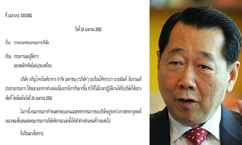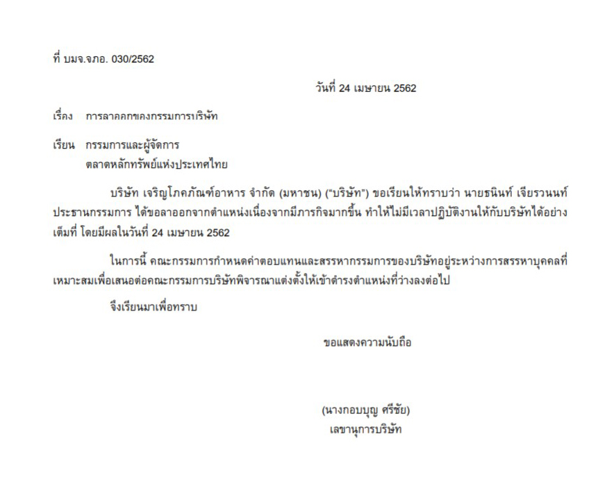 เมื่อวันที่ 24 เม.ย.2562 บริษัท เจริญโภคภัณฑ์อาหาร จำกัด (มหาชน) หรือ ซีพีเอฟได้แจ้งตลาดหลักทรัพย์แห่งประเทศไทย เรื่อง การลาออกจากตำแหน่งประธานกรรมการบริษัทฯ ของนายธนินท์ เจียรวนนท์ เนื่องจากมีภารกิจมากขึ้น ทำให้ไม่มีเวลาปฏิบัติงานให้กับบริษัทได้อย่างเต็มที่ โดยมีผลตั้งแต่วันที่ 24 เม.ย.2562 เป็นต้นไป ซึ่งคณะกรรมการกำหนดค่าตอบแทนและสรรหากรรมการของบริษัทอยู่ระหว่างการสรรหาบุคคลที่เหมาะสมเพื่อเสนอต่อคณะกรรมการบริษัทพิจารณาแต่งตั้งให้ดำรงตำแหน่งที่ว่างลงต่อไป (ดูหนังสือประกอบ)
