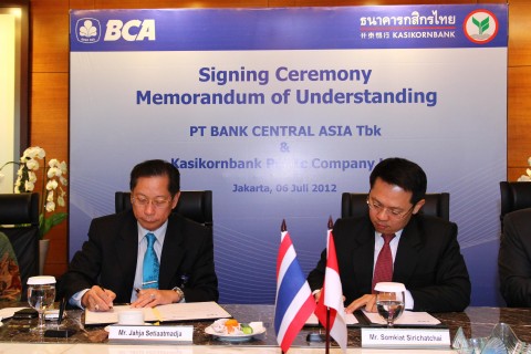 นายสมเกียรติ ศิริชาติไชย รองกรรมการผู้จัดการอาวุโส ธนาคารกสิกรไทย เปิดเผยว่า ธนาคารได้ร่วมลงนามในบันทึกความเข้าใจเพื่อความร่วมมือระหว่างประเทศกับแบงก์ เซ็นทรัล เอเชีย (Bank Central Asia หรือ BCA) ซึ่งเป็นธนาคารเอกชนอันดับหนึ่งในประเทศอินโดนีเซีย มีสาขาที่ครอบคลุมกว่า 900 สาขาทั่วประเทศ มุ่งเน้นและอำนวยความสะดวกในการให้บริการด้านการเงินกับลูกค้าของธนาคารกสิกรไทยที่ทำธุรกรรมระหว่างประเทศทั้งด้านการค้าและการลงทุน ธนาคารมองว่าประเทศอินโดนีเซียมีความแข็งแกร่งในเชิงเศรษฐกิจและการลงทุน โดยกองทุนการเงินระหว่างประเทศ (IMF) คาดว่าเศรษฐกิจอินโดนีเซียปี 2556 (Real GDP) โตขึ้นร้อยละ 6.1 (YoY) ซึ่งเป็นอัตราการเติบโตในระดับที่ค่อนข้างสูงเมื่อเทียบกับประเทศอื่นในภูมิภาคอาเซียนซึ่งเป็นเครื่องยืนยันถึงทิศทางเศรษฐกิจอินโดนีเซียที่กำลังขยายตัวเป็นอย่างมาก