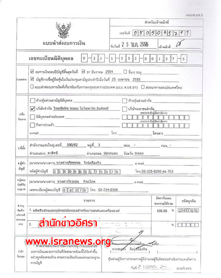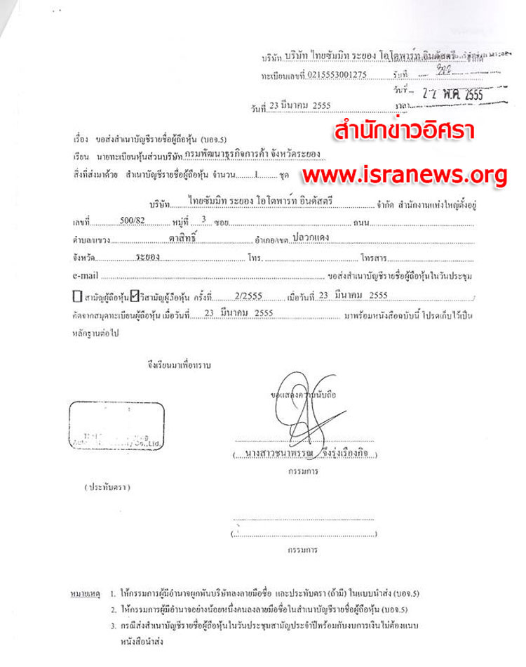 22 พ.ค. 2555 นำส่งผู้ถือหุ้น (บอจ.5) ต่อนายทะเบียนหุ้นส่วนบริษัทจังหวัดระยอง ระบุวิสามัญผู้ถือหุ้นครั้งที่ 2/2555 เมื่อวันที่ 23 มี.ค.2555 คัดจากสมุดทะเบียนผู้ถือหุ้น วันที่ 23 มี.ค.2555 ระบุมีทุนจดทะเบียน 7,500,000 บาท (ตัวเลขทุนจดทะเบียนที่ปรากฏในเอกสารอาจคลาดเคลื่อน?เพราะถ้ารวมจำนวนหุ้นน่าจะเป็น 750,000,000 บาท) แบ่งออกเป็น 7,500,000 หุ้น มูลค่าหุ้นละ 100 บาท มีผู้ถือหุ้น 5 คน แต่ละคนถือหุ้นเพิ่มคนละ 500,000 หุ้น เป็นคนละ 1,500,000 หุ้น (น่าสังเกตประชุมเมื่อวันที่ 23 มี.ค.2555 นำส่งวันที่ 22 พ.ค.2555 เกินกว่า 14 วันหลังประชุม? ) (ดูเอกสาร)