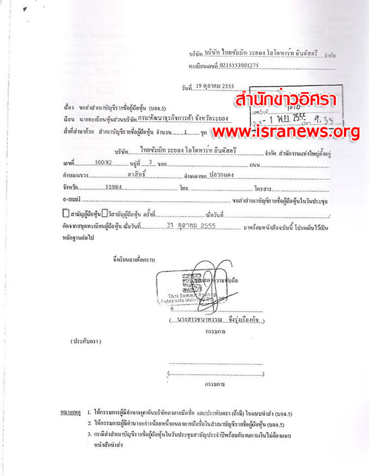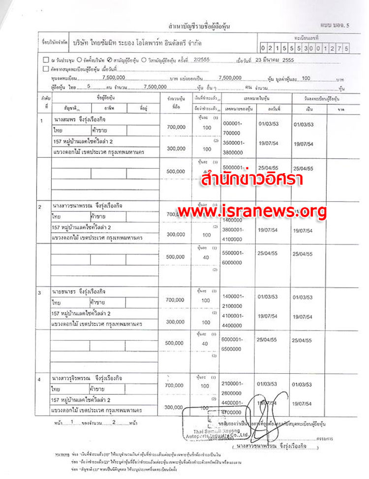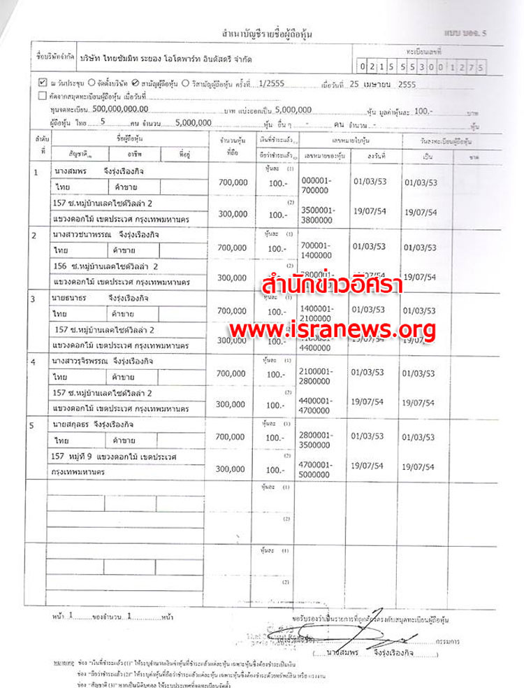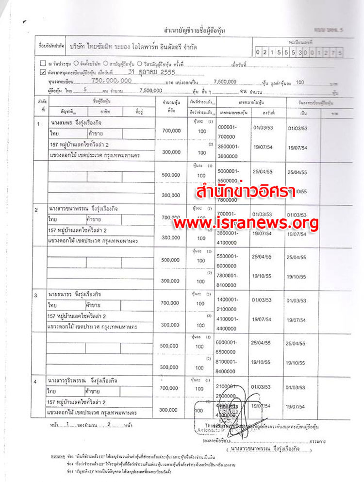 1 พ.ย. 2555 นำส่งบัญชีผู้ถือหุ้น (บอจ.5) ต่อนายทะเบียนหุ้นส่วนบริษัท อีกครั้ง ระบุ คัดจากการประชุมผู้ถือหุ้นเมื่อวันที่ 31 ต.ค.2555 ระบุทุนจดทะเบียน 750 ล้านบาทแบ่งเป็น 7,500,000 หุ้น มูลค่าหุ้นละ 100 บาท ผู้ถือหุ้น 5 คน แต่กลับระบุแต่ละคน ถือหุ้นคนละ 1,800,000 หุ้น (ดูเอกสาร)