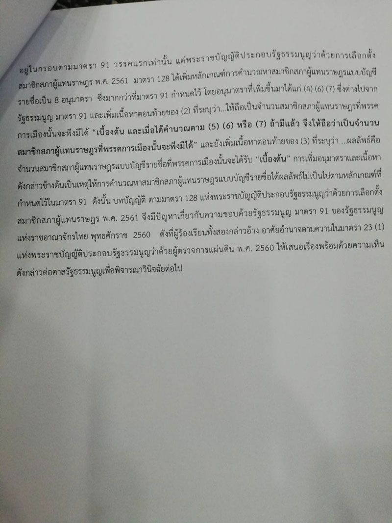 ประเด็นต่อมา ขอให้ผู้ตรวจการแผ่นดินเสนอเรื่องพร้อมด้วยความเห็นต่อศาลรัฐธรรมนูญเพื่อพิจารณาวินิจฉัย กรณี พ.ร.บ.เลือกตั้ง ส.ส. มาตรา 128 มีปัญหาเกี่ยวกับความชอบด้วยรัฐธรรมนูญปี 2560 มาตรา 91 นั้น พิจารณาแล้วเห็นว่า มาตรา 91 วรรคแรก ได้วางหลักเกณฑ์การคำนวณหาสมาชิก ส.ส. บัญชีรายชื่อของแต่ละพรรคการเมืองไว้ตาม (1) ถึง (5) โดยผลลัพธ์ของการคำนวณต้องไม่มีผลให้พรรคการเมืองใด มี ส.ส. เกินจำนวนที่จะพึงมีได้
