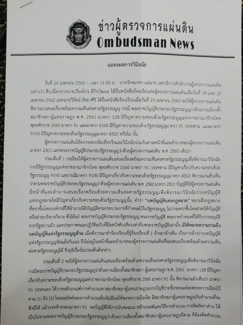 ผู้สื่อข่าวสำนักข่าวอิศรา www.isranews.org รายงานว่า เมื่อวันที่ 26 เม.ย. 2562 ที่ประชุมผู้ตรวจการแผ่นดิน มีมติตีตกข้อร้องเรียนของนายเรืองไกร ลีกิจวัฒนะ อดีตทีมกฎหมายอดีตพรรคไทยรักษาชาติ (ทษช.) ที่ขอให้ผู้ตรวจการแผ่นดินส่งเรื่องไปยังศาลรัฐธรรมนูญ ขอให้วินิจฉัยว่าการเลือกตั้งเมื่อวันที่ 24 มี.ค. 2562 เป็นโมฆะอย่างไรก็ดีผู้ตรวจการแผ่นดินมีมติเอกฉันท์ส่งศาลรัฐธรรมนูญพิจารณากรณีการคำนวณ ส.ส.บัญชีรายชื่อ