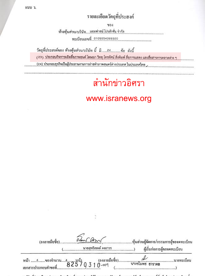 1.บริษัท แอมฟายน์ โปรดักชั่น จำกัด จดทะเบียนวันที่ 27 พ.ค. 2554 ทุน 1 ล้านบาท แจ้งวัตถุประสงค์ 23 ข้อ ข้อ (23) ระบุ ประกอบกิจการผลิตสื่อภาพยนตร์ โฆษณา วิทยุ โทรทัศน์ สิ่งพิมพ์ สื่อการแสดง และสื่อการตลาดต่างๆ (ดูเอกสาร) ที่ตั้งเลขที่ 14/13 อาคาร14 ชั้น 4 ซอยรามคำแหง 30/1 แยก 2 ถนนรามคำแหง แขวงหัวหมาก เขตบางกะปิ กรุงเทพมหานคร มีนายสุทธิเขตต์ คงถาวร นายธัญญ์วาริน สุขะพิสิษฐ์ นายฐิติพันธ์ รักษาสัตย์ ร่วมกันเป็นกรรมการ นายสุทธิเขตต์ คงถาวร และ นายธัญญ์วาริน สุขะพิสิษฐ์ เป็นกรรมการผู้เริ่มก่อการ/กรรมการผู้ขอจดทะเบียน ผู้ถือหุ้น ณ วันที่ 27 พ.ค.2554 นายสุทธิเขตต์ คงถาวร ถือ 3,334 หุ้น (34.33%) นายธัญญ์วาริน สุขะพิสิษฐ์ และ นายฐิติพันธ์ รักษาสัตย์ คนละ 3,333 หุ้น (คนละ 33.33%) รวมทั้งสิ้น 10,000 หุ้น มูลค่าหุ้นละ 100 บาท บริษัทฯแจ้งผู้ถือหุ้นอีกครั้ง (บอจ.5) วันที่ 30 เม.ย.2558 ทั้ง 3 คนถือหุ้นจำนวนเท่าเดิม หลังจากนั้นไม่มีการส่งบัญชีผู้ถือหุ้น (บอจ.5) จนถึงขณะนี้ แจ้งงบการเงินล่าสุดรอบสิ้นสุด 31 ธ.ค. 2557 รายได้ 1,509,517.44 บาท ขาดทุนสุทธิ 273,270.54 บาท สินทรัพย์ 3,510,788.26 บาท หนี้สิน 5,765,779 บาท ขาดทุนสะสม 3,254,990.74 บาท