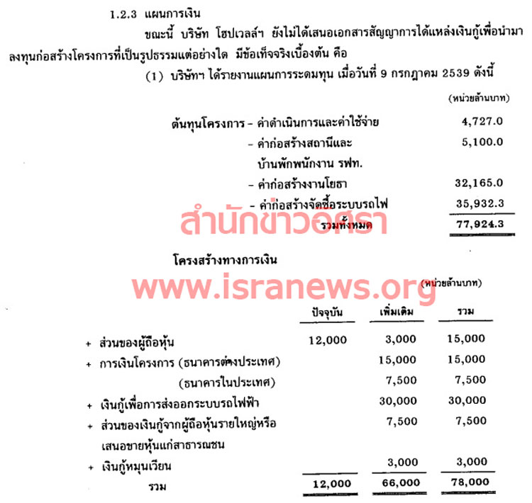ขณะที่โครงสร้างทางการเงินของบริษัท โฮปเวลล์ ระบุว่า มีทุนจดทะเบียนของผู้ถือหุ้นรวม 15,000 ล้านบาท (เท่ากับในปัจจุบันเมื่อปี 2560) มีการเงินโครงการ ธนาคารต่างประเทศ 15,000 ล้านบาท ธนาคารในประเทศ 7,500 ล้านบาท เงินกู้เพื่อการส่งออกระบบรถไฟฟ้า 30,000 ล้านบาท ส่วนของเงินกู้จากผู้ถือหุ้นรายใหญ่หรือเสนอขายหุ้นแก่สาธารณชน 7,500 ล้านบาท เงินกู้หมุนเวียน 3,000 ล้านบาท รวมเป็นเงิน 78,000 ล้านบาท (ดูเอกสารประกอบ)