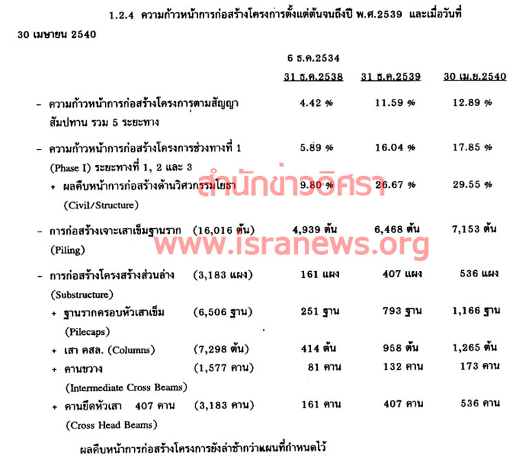 “...ความคืบหน้าโครงการนั้น รายงาน 3 ช่วง คือ เมื่อวันที่ 31 ธ.ค. 2538 คืบหน้าทั้งหมด 4.42% วันที่ 31 ธ.ค. 2539 คืบหน้าทั้งหมด 11.59% และวันที่ 30 เม.ย. 2540 คืบหน้าทั้งหมด 12.89% กระทรวงคมนาคมระบุว่า ผลคืบหน้าการก่อสร้างโครงการยังล่าช้ากว่าแผนที่กำหนดไว้…”