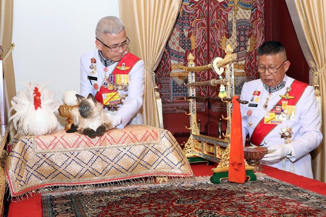 ร้อยโท ฉัตรณรงค์ เรืองพุก เชิญพานพระขันหมากทองคำลงยาองค์ใหญ่เครื่องพร้อม เชิญไปทอดที่บนโต๊ะทองข้างที่ประทับด้านขวา, ร้อยเอก อภิชิต มุกข์โตเกียว เชิญพานพระโอสถไปทอดที่บนโต๊ะทองข้างที่ประทับด้านซ้าย ที่เหลือผู้เชิญนำไปมอบให้ พันโท สมชาย กาญจนมณี ที่พระที่นั่งองค์ตะวันออก เสร็จแล้วกลับมา เฝ้าฯ ที่ท้องพระโรงกลาง พันโท สมชาย กาญจนมณี นำพระแสงไปทอดที่บันไดแก้ว รับเครื่องทั้งหมดไปทอดไว้ที่โต๊ะบนชั้นลด รับแมวและไก่ขาว ให้เจ้าพนักงานอุ้มเชิญไว้ ผู้เชิญเทียนส่งเทียนให้เจ้าพนักงานแล้วไปรวมเฝ้าฯ ที่ท้องพระโรงกลาง