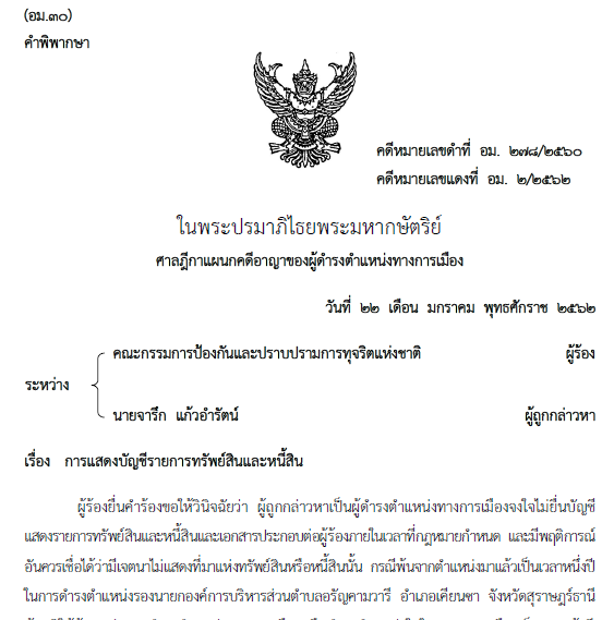 1.นายจารึก แก้วอำรัตน์ นายกองค์การบริหารส่วนตำบล (อบต.) อรัญคามวารี อ.เคียนซา จ.สุราษฎร์ธานี จงใจไม่ยื่นบัญชี แสดงรายการทรัพย์สินและหนี้สินและเอกสารประกอบต่อผู้ร้องภายในเวลาที่กฎหมายกำหนด และมีพฤติการณ์อันควรเชื่อได้ว่ามีเจตนาไม่แสดงที่มาแห่งทรัพย์สินหรือหนี้สินนั้น กรณีพ้นจากตำแหน่งมาแล้วเป็นเวลาหนึ่งปี พิพากษาว่า นายจารึก แก้วอำรัตน์ ผู้ถูกกล่าวหาจงใจไม่ยื่นบัญชีแสดงรายการทรัพย์สินและหนี้สินและเอกสารประกอบต่อคณะกรรมการ ป.ป.ช. ภายในเวลาที่กฎหมายกำหนด กรณีพ้นจากตำแหน่งมาแล้วเป็นเวลาหนึ่งปี ตามพระราชบัญญัติประกอบรัฐธรรมนูญ ว่าด้วยการป้องกันและปราบปรามการทุจริต พ.ศ. 2542 มาตรา 32 และมาตรา 33 ห้ามมิให้ ผู้ถูกกล่าวหาดำรงตำแหน่งทางการเมืองหรือดำรงตำแหน่งใดในพรรคการเมืองเป็นเวลาห้าปีนับแต่วันที่ 1 ก.พ.2556 ซึ่งเป็นวันที่ผู้ถูกกล่าวหาพ้นจากตำแหน่ง ตามพระราชบัญญัติประกอบรัฐธรรมนูญว่าด้วยการป้องกันและปราบปรามการทุจริต พ.ศ. 2542 มาตรา 34 วรรคสอง กับมีความผิดตามพระราชบัญญัติประกอบรัฐธรรมนูญว่าด้วยการป้องกันและปราบปรามการทุจริต พ.ศ. 2542 มาตรา 119 จำคุก 2 เดือน และปรับ 8,000 บาท ผู้ถูกกล่าวหาให้การรับสารภาพ เป็นประโยชน์ แก่การพิจารณา มีเหตุบรรเทาโทษ ลดโทษให้กึ่งหนึ่งตามประมวลกฎหมายอาญา มาตรา 78 คงจำคุก 1 เดือน และปรับ 4,000 บาท ไม่ปรากฏว่าผู้ถูกกล่าวหาเคยได้รับโทษจำคุกมาก่อน โทษจำคุกจึงให้รอการลงโทษไว้มีกำหนด 1 ปี (คดีหมายเลขแดงที่ อม.2/2562-22 ม.ค.2562)