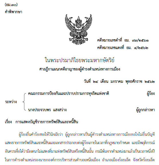 2.นางประจวบพร แสงสว่าง รองนายกองค์การบริหารส่วนตำบล (อบต.) เหนือเมือง อ.เมืองร้อยเอ็ด จ.ร้อยเอ็ด จงใจไม่ยื่นบัญชีแสดงรายการทรัพย์สินและหนี้สินและเอกสารประกอบต่อผู้ร้องภายในเวลาที่กฎหมายกำหนด และมีพฤติการณ์ อันควรเชื่อได้ว่ามีเจตนาไม่แสดงที่มาแห่งทรัพย์สินหรือหนี้สินนั้น กรณีพ้นจากตำแหน่งมาแล้วเป็นเวลาหนึ่งปี พิพากษาว่า นางประจวบพร แสงสว่าง ผู้ถูกกล่าวหาจงใจไม่ยื่นบัญชีแสดงรายการทรัพย์สินและหนี้สินและเอกสารประกอบต่อคณะกรรมการ ป.ป.ช. ภายในเวลาที่กฎหมายกำหนด กรณีพ้นจากตำแหน่งมาแล้วเป็นเวลาหนึ่งปี ในการดำรงตำแหน่งรองนายก อบต.เหนือเมือง ห้ามมิให้ผู้ถูกกล่าวหาดำรงตำแหน่ง ทางการเมืองหรือดำรงตำแหน่งใดในพรรคการเมืองเป็นเวลาห้าปีนับแต่วันที่ 19 เม.ย.2556 ซึ่งเป็นวันที่ผู้ถูกกล่าวหาพ้นจากตำแหน่ง กับมีความผิดตามพระราชบัญญัติประกอบรัฐธรรมนูญว่าด้วยการป้องกันและปราบปรามการทุจริต พ.ศ. 2542 มาตรา 119 จำคุก 2 เดือน และปรับ 8,000 บาท ผู้ถูกกล่าวหาให้การรับสารภาพ เป็นประโยชน์แก่การพิจารณา มีเหตุบรรเทาโทษลดโทษให้กึ่งหนึ่งตามประมวลกฎหมายอาญา มาตรา 78 คงจำคุก 1 เดือน และปรับ 4,000 บาท ไม่ปรากฏว่าผู้ถูกกล่าวหาเคยได้รับโทษจำคุกมาก่อน โทษจำคุกจึงให้รอการลงโทษไว้มีกำหนด 1 ปี (คดีหมายเลขแดงที่ อม.4/2562-24 ม.ค.2562)