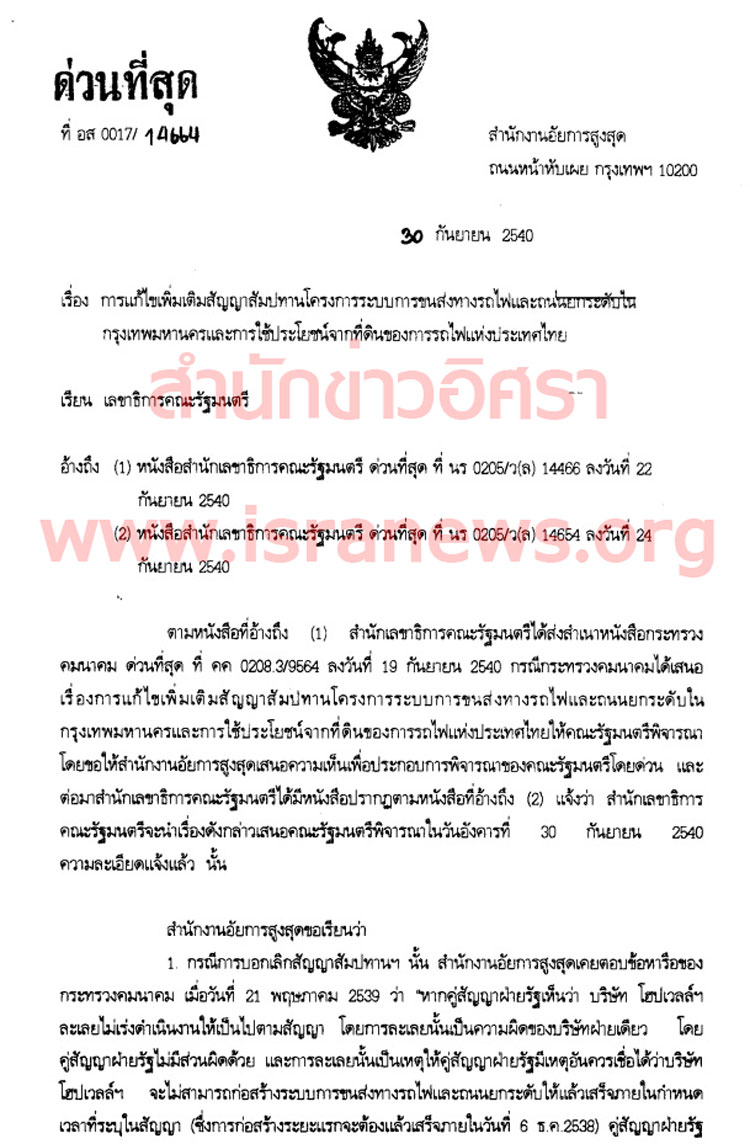 นายคณิต ณ นคร อัยการสูงสุด (ขณะนั้น) มีหนังสือถึงเลขาธิการคณะรัฐมนตรี ตอบกลับข้อหารือกระทรวงคมนาคม เรื่อง การแก้ไขเพิ่มเติมสัญญาสัมปทานโครงการระบบการขนส่งทางรถไฟและถนนยกระดับใน กทม. และการใช้ประโยชน์จากที่ดินของ รฟท.