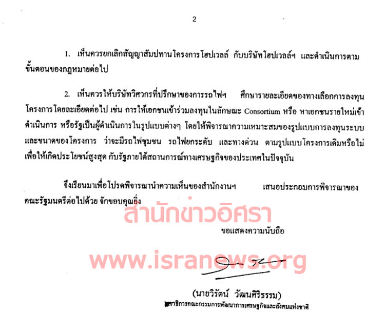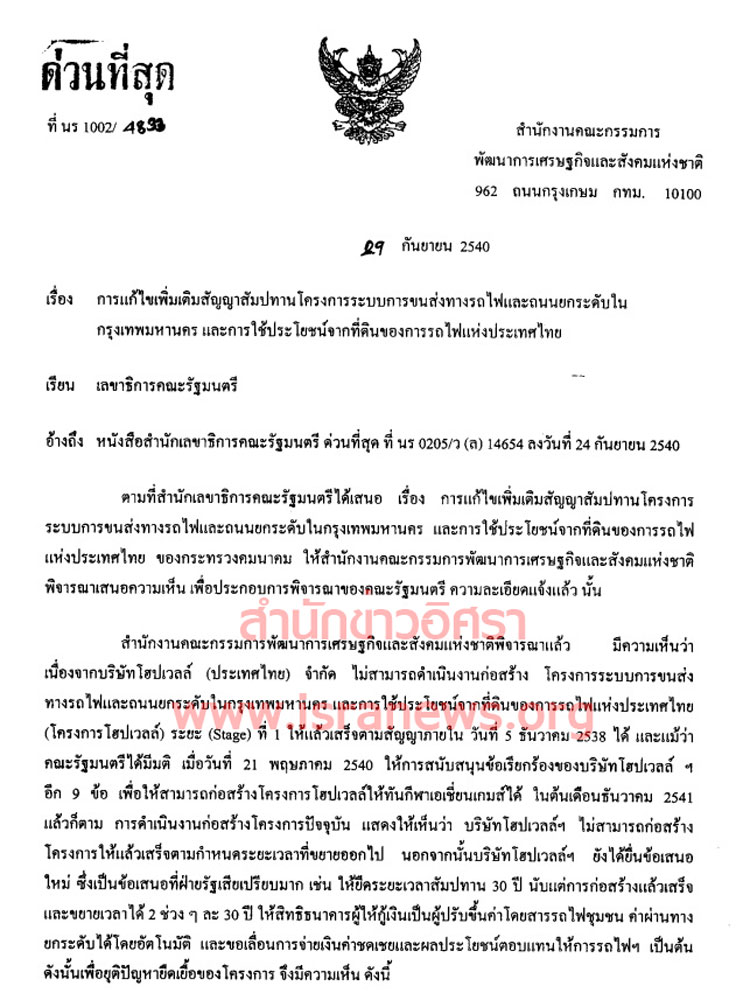 นายวิรัตน์ วัฒนศิริธรรม เลขาธิการคณะกรรมการพัฒนาการเศรษฐกิจและสังคมแห่งชาติ ทำหนังสือด่วนที่สุด ที่ นร 1002/4838 ถึงคณะรัฐมนตรี