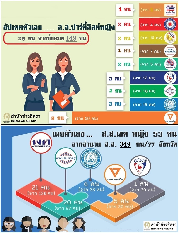 ตัวเลขทางการ จำนวน ส.ส.หญิง แบบแบ่งเขต-บัญชีรายชื่อ รวมทั้งสิ้น 78 คน