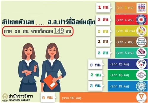 ขณะที่ส.ส.บัญชีรายชื่อที่ประกาศอย่างเป็นทางการ 149 ราย รวม 26 พรรค พบว่า มีส.ส.หญิงทั้งสิ้น 25 คน มากสุดอยู่ที่พรรคอนาคตใหม่ 9 คน