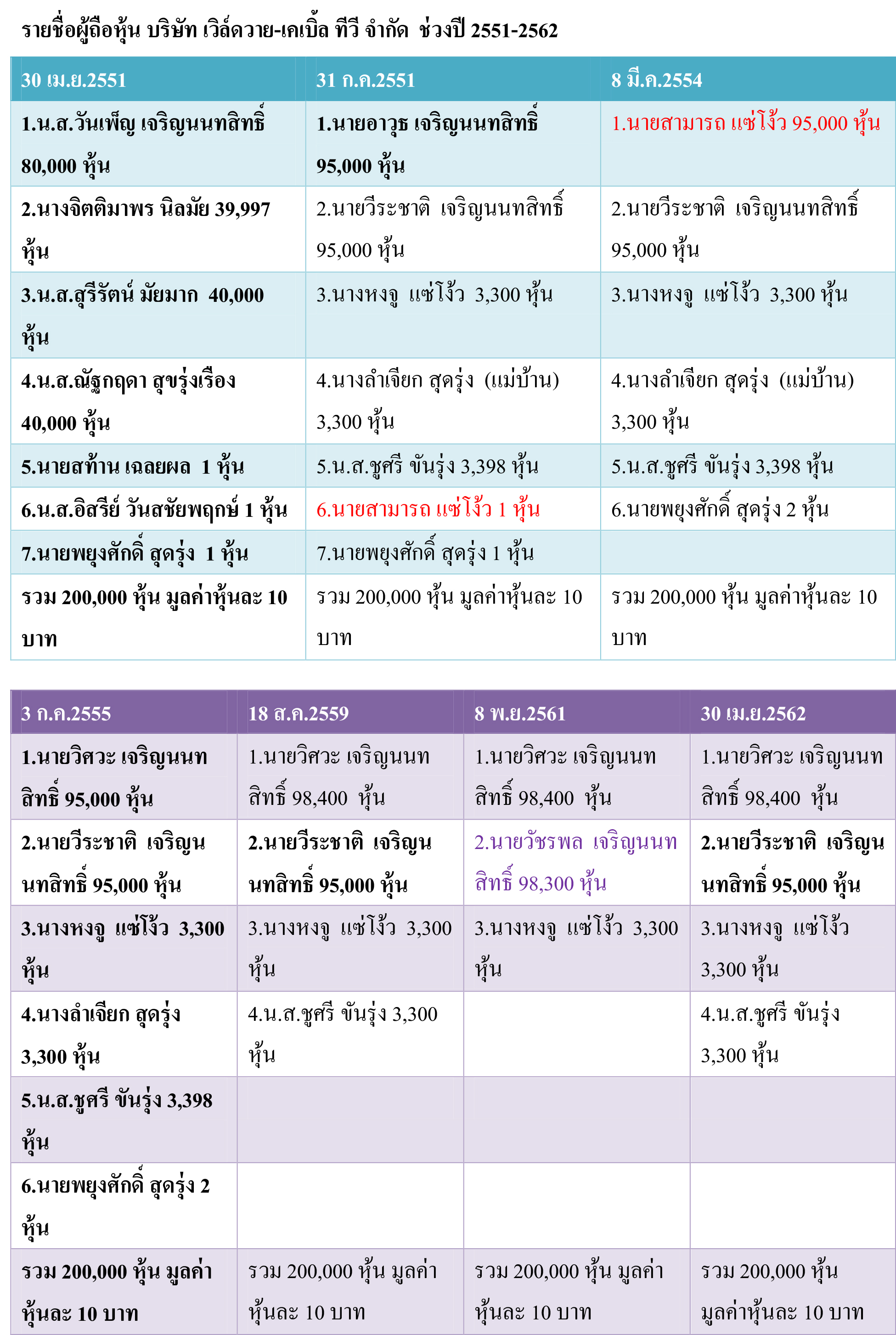 สำนักข่าวอิศรา www.isranews.org เรียบเรียงข้อมูลจากเอกสารบัญชีรายชื่อผู้ถือหุ้น บริษัท เวิล์ดวาย-เคเบิ้ล ทีวี จำกัด มารายงานอย่างชัดๆ