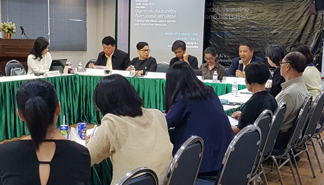 วันที่ 16 พ.ค. ที่ สมาคมนักข่าวนักหนังสือพิมพ์แห่งประเทศไทย มีการจัดเวทีเสวนา Media Forum ครั้งที่ 9 เรื่อง “ถอดบทเรียนปัญหาข่าวลวงในประเทศไทย กับทางออกเชิงสร้างสรรค์” หรือ “Fighting Fake news : Lesson-learned and constructive resolution” จัดโดยสภาการหนังสือพิมพ์แห่งชาติ, Friedrich Naumann Foundation, กองทุนพัฒนาสื่อปลอดภัยและสร้างสรรค์, คณะวารสารศาสตร์และสื่อสารมวลชน มหาวิทยาลัยธรรมศาสตร์, และ Centre for Humanitarian Dialogue